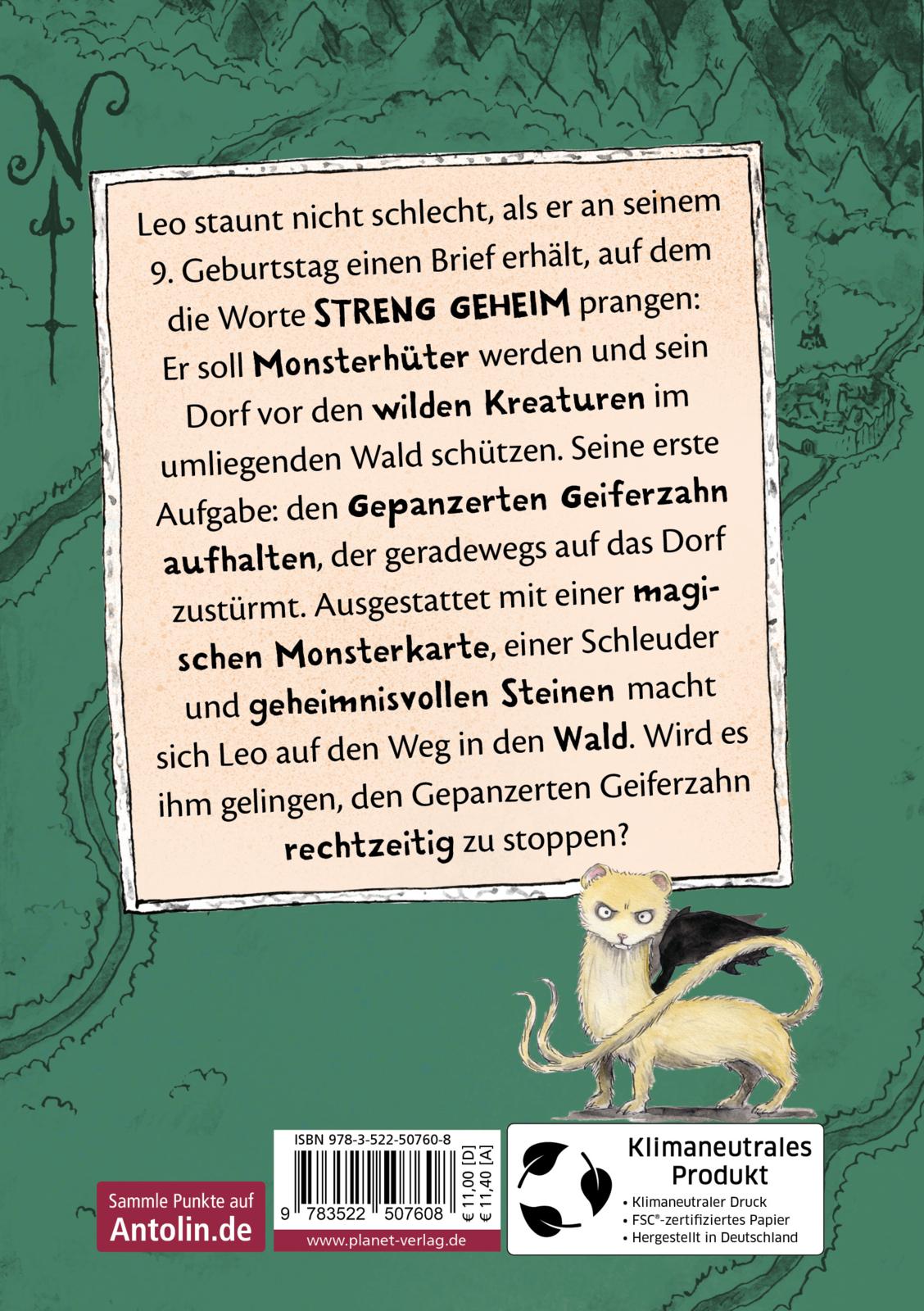 Leo staunt nicht schlecht, als er an seinem 9. Geburtstag einen Brief erhält, auf dem die Worte „STRENG GEHEIM“ prangen: Er soll Monsterhüter werden und sein Dorf vor den wilden Kreaturen im umliegenden Wald schützen. Seine erste Aufgabe: den Gepanzerten Geiferzahn aufhalten, der geradewegs auf das Dorf zustürmt. Ausgestattet mit einer magischen Monsterkarte, einer Schleuder und geheimnisvollen Steinen macht sich Leo auf den Weg in den Wald. Wird es ihm gelingen, den Gepanzerten Geiferzahn rechtzeitig zu stoppen?