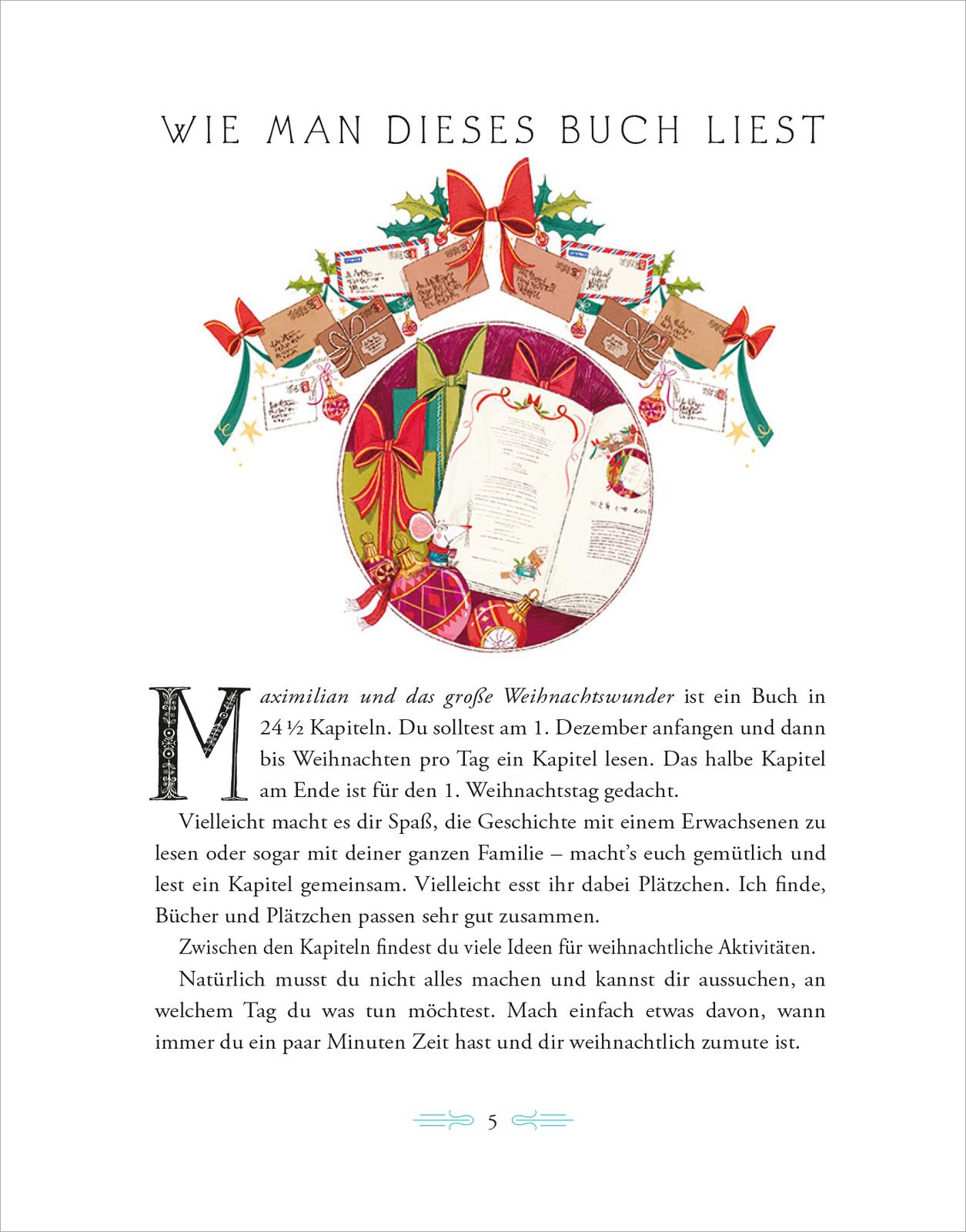 - Beschreibung Ein zauberhaftes Adventskalenderbuch zum Vorlesen und Lesen Dieses bunte, liebevoll gestaltete Kinderbuch eignet sich perfekt zum Lesen und Vorlesen für Kinder ab 5 Jahren. Die Geschichte wird in 24 ½ Kapiteln erzählt, mit einem Kapitel für jeden Tag im Advent, vom 1. Dezember bis Weihnachten. Außerdem enthält es Rezepte und Basteltipps für die ganze Familie. Es ist ein wunderschöner Begleiter für die Vorweihnachtszeit.Der kleine Mäuserich Maximilian ist zurück!Bald ist Weihnachten und der kleine Mäuserich Maximilian muss ein kurioses Rätsel lösen. Immer wieder hat er verschwommene Erinnerungen an eine andere Maus. Er spürt, dass sie eine wichtige Rolle in seinem Leben gespielt hat. Maximilian möchte diese Maus unbedingt finden! Also macht er sich auf eine turbulente Reise um die Welt. Zum Glück hat er wunderbare Freunde, die ihm auf dieser abenteuerlichen Suche zur Seite stehen!Ein herzerwärmendes Kinderbuch zur Weihnachtszeit: Süß wie ein Adventskalender – nur ohne Schokolade!Zeitlose Vorlesegeschichte: Ein Kinderbuch über Mut, Freundschaft und die Suche nach einem ZuhauseLiebevoll gestaltet: Stimmungsvolle, bunte Bilder, großes FormatMit Rezepten, Gedichten und BastelanleitungenZauberhaftes Geschenk: Für Jungen und Mädchen ab 6 JahrenÜber das Buch Dieses wunderschöne Kinderbuch des Bestsellerautors Alex T. Smith eignet sich perfekt zum gemeinsamen Lesen und Vorlesen für die Adventszeit. Die warmherzige Adventskalendergeschichte ist jetzt schon ein moderner Kinderbuchklassiker und ein ideales Geschenk für Kinder ab 5 Jahren.Band 1: Maximilian und der verlorene Wunschzettel (ISBN 9783845845357)Band 2: Maximilian und das große Weihnachtswunder (ISBN 9783845848969)