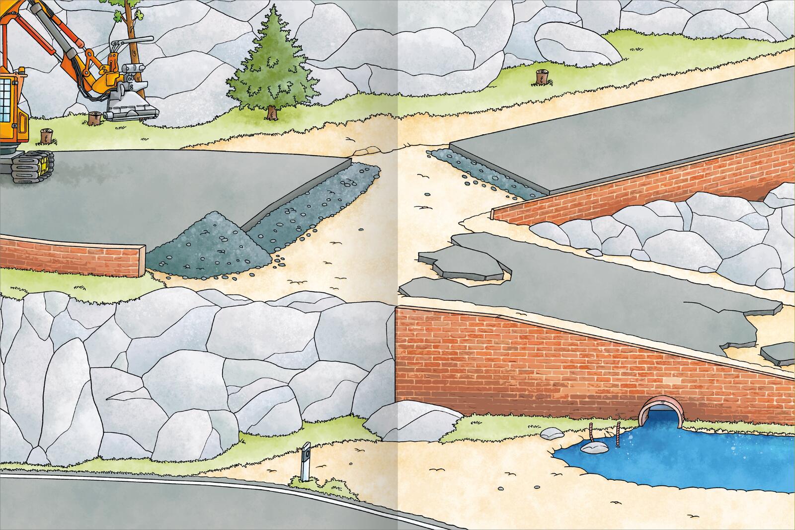 Auf der Baustelle herrscht reges Treiben! Mit über 300 Stickern kannst du Bagger, Kräne und Betonmischer auf den verschiedenen Baustellen einsetzen.