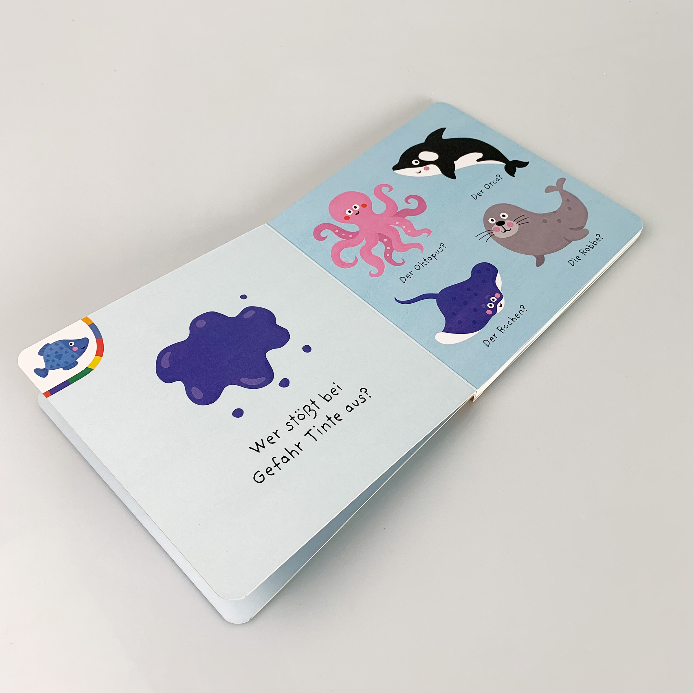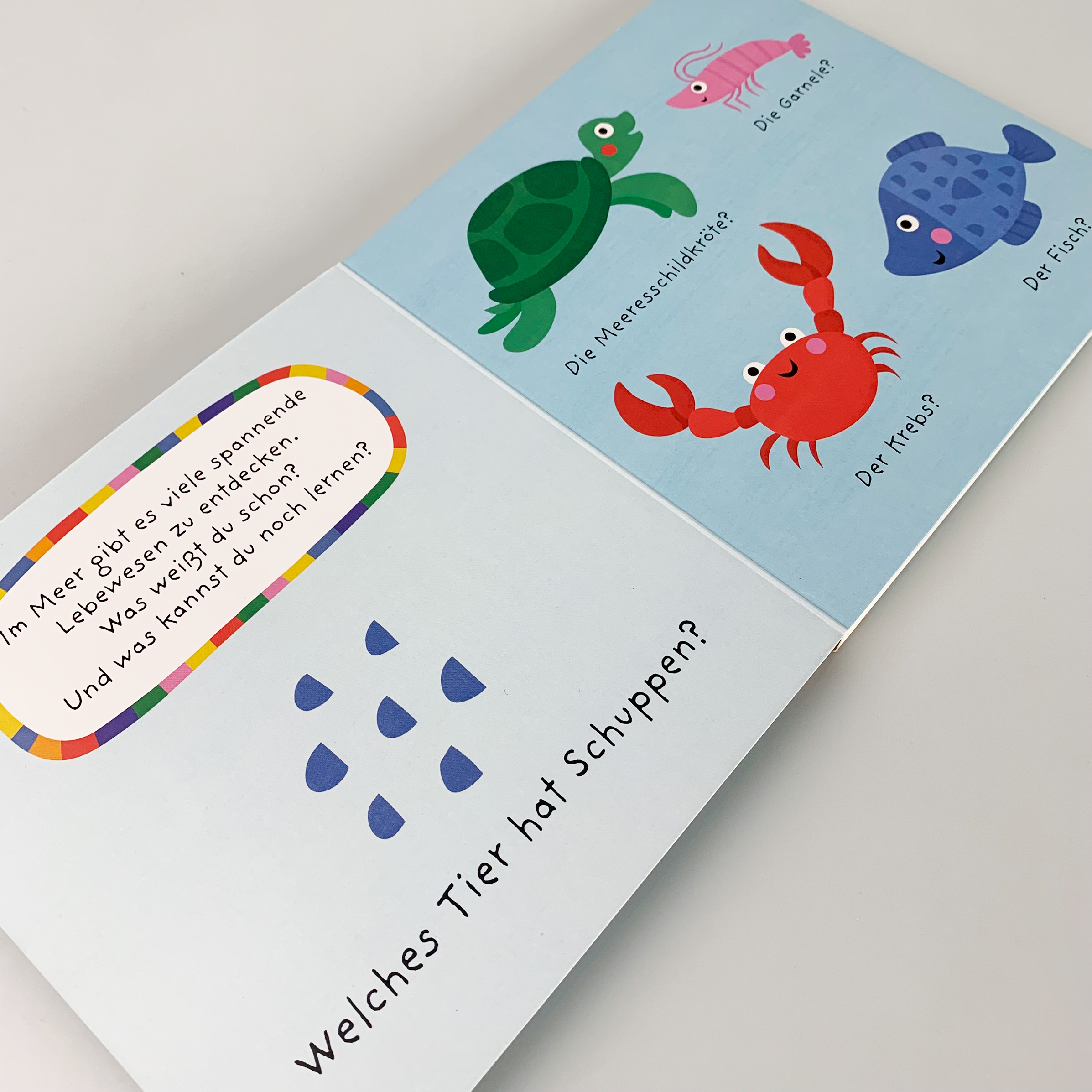 Ein tierisches Pappbilderbuch mit spannenden Quizfragen rund um das Meer und seine Bewohner.