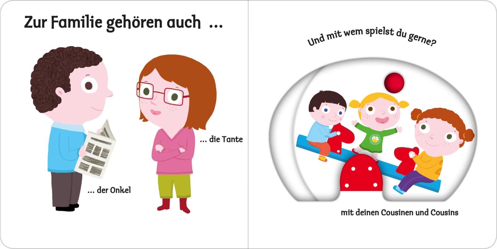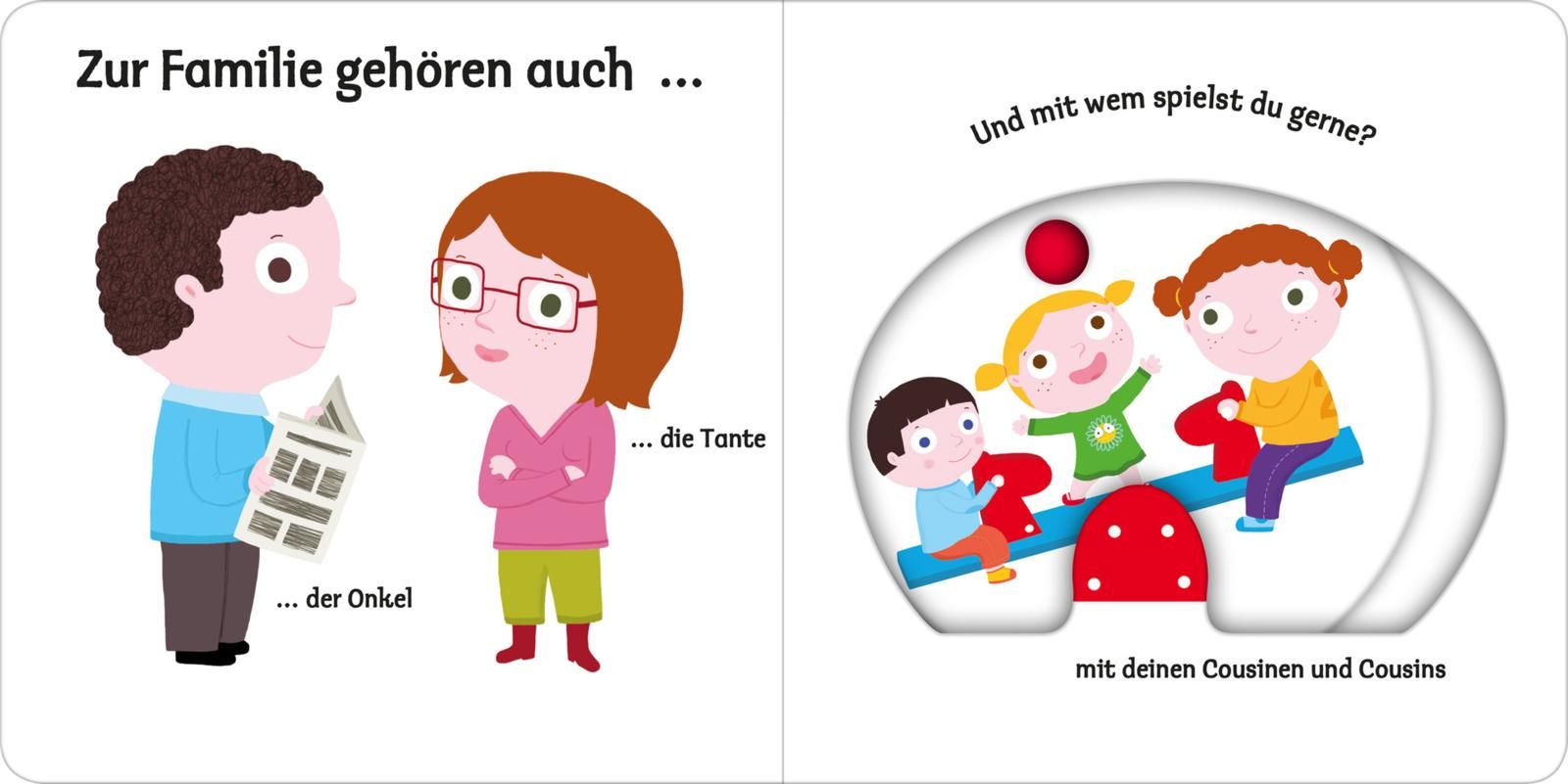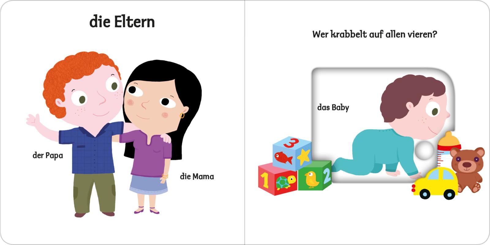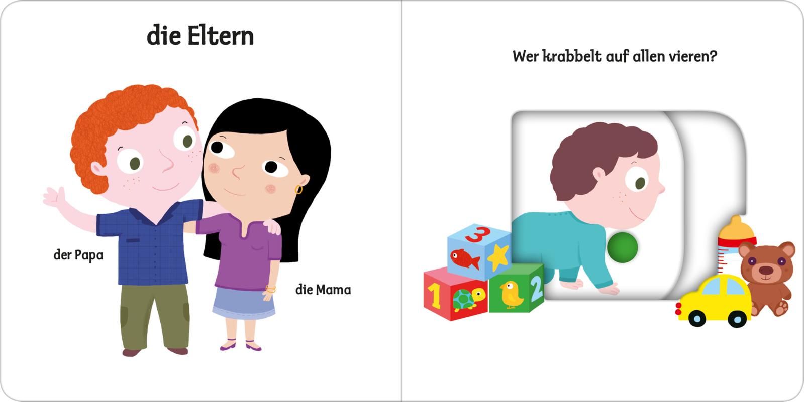 Bunte, leicht zu erkennende Bilder, eine klare Aufteilung und nicht zu viel auf einer Seite: Hier lernen schon Kinder ab einem Jahr erste Wörter zum Thema "Familie". Die lustigen und stabilen Schiebeelemente im Buch fördern die Feinmotorik und das Verständnis. Einfach den großen Schieber bewegen und schon verstecken sich die Geschwister hinter dem Busch. Sehen, zuhören, aktiv werden – so wird Sprechenlernen zum Kinderspiel, egal ob zu Hause, bei der Oma, im Kindergarten oder in der Krippe.