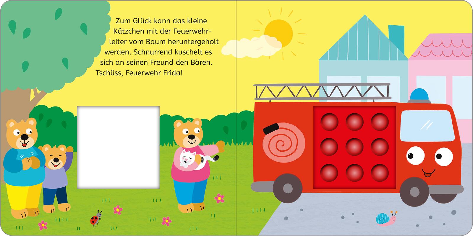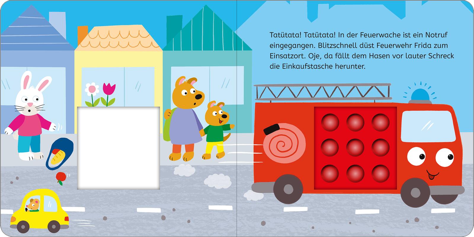 Tatütata! Feuerwehr Frida hat heute ihren ersten Einsatz. Aufgeregt düst sie zur Einsatzstelle. Kätzchen Cleo kommt nämlich nicht mehr vom Baum herab und muss mit der Feuerwehrleiter gerettet werden. Zum Glück ist Feuerwehr Frida sofort zur Stelle. Was für ein aufregender Tag! Eine erste Vorlesegeschichte mit bunten Pop-its, die ein lustiges Ploppgeräusch machen, wenn man sie drückt. Das Spielbuch mit stabilen Pappseiten ist bereits für Kinder ab 18 Monaten geeignet.