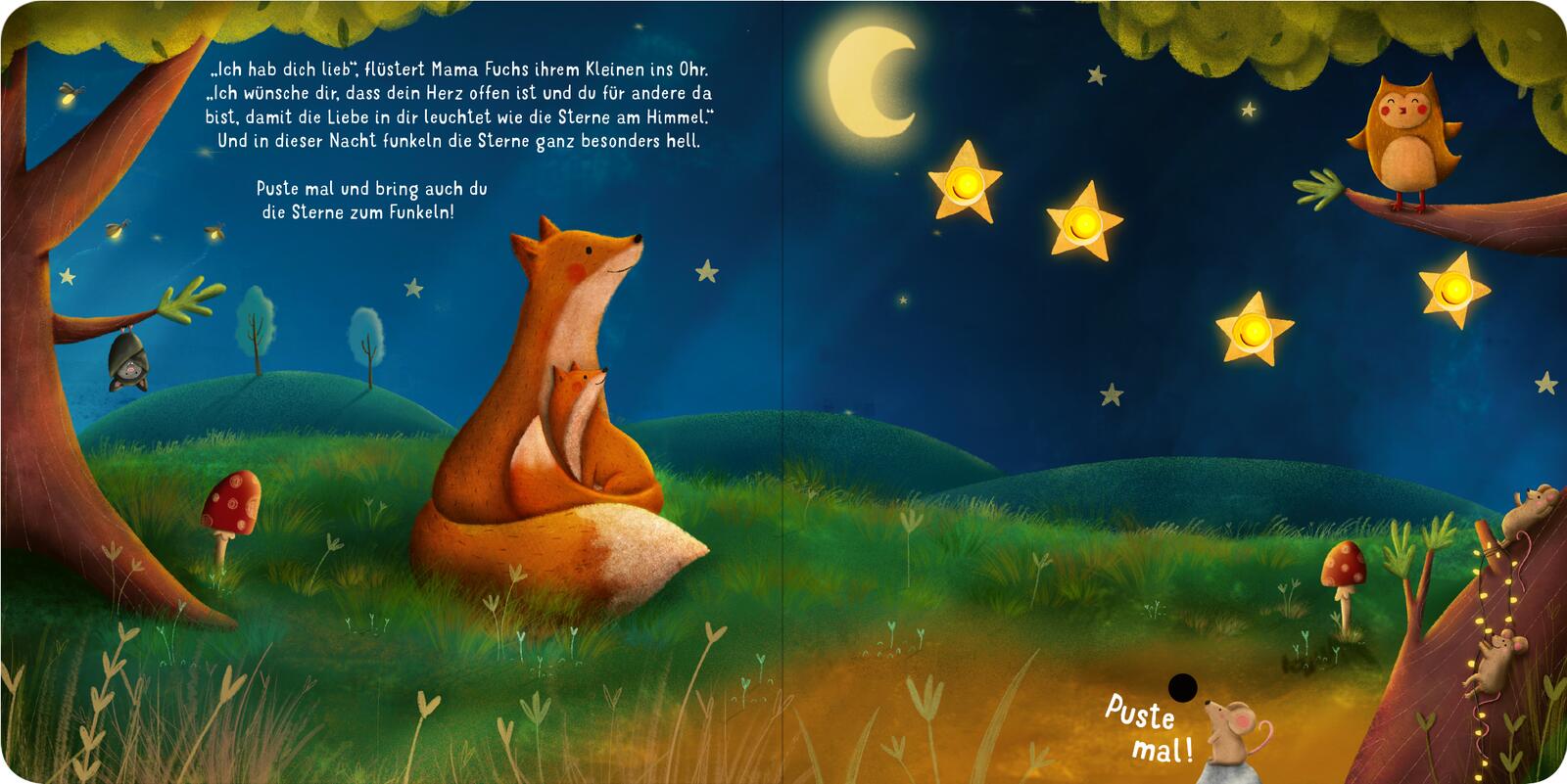 Es ist Liebhabenzeit für die kleinen Tiere im Wald. Opa Dachs spielt mit seiner Gitarre sein Lieblingslied, um seinem Enkel eine Freude zu bereiten. Der tanzt vergnügt zum Takt und sorgt für einen kunterbunten Konfettiregen. Und Mama Fuchs? Die lässt die Sterne am Himmel für den kleinen Fuchs hell leuchten! So lieb hat sie ihn.