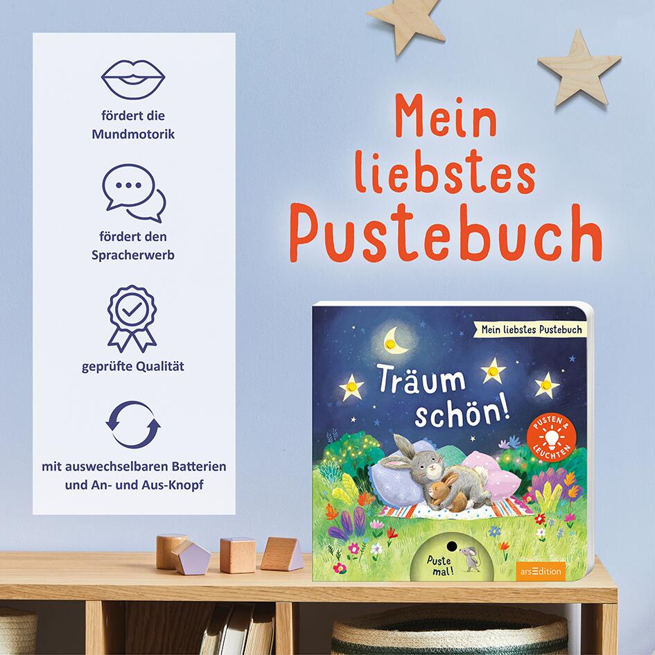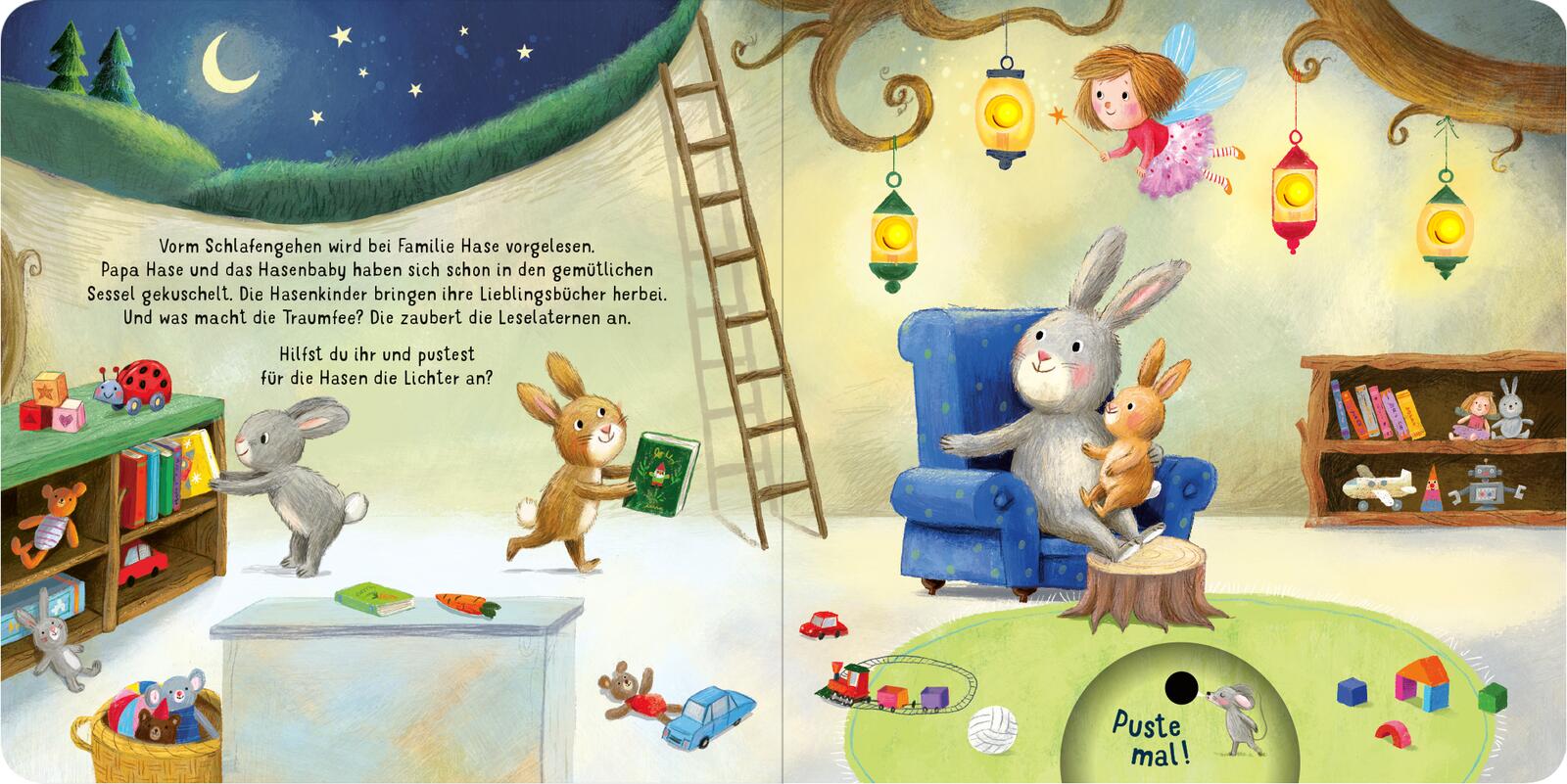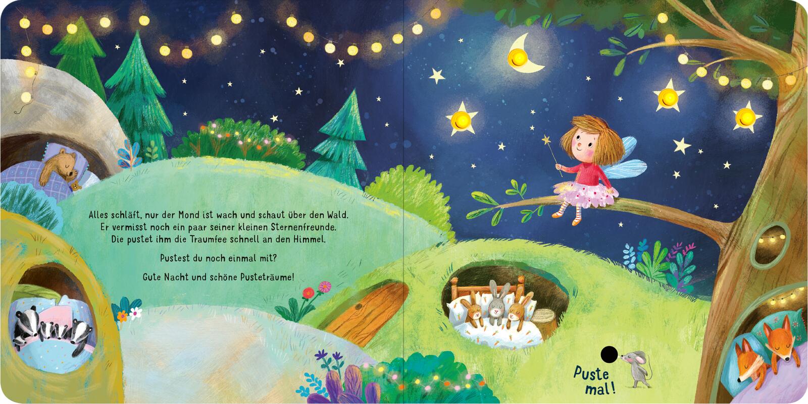Das interaktive Gutenachtbuch bietet magischen Pustespaß, der kleine Augen funkeln lässt. Durch das Pusten auf den im Buch integrierten Sensor beginnen auf jeder Seite 4 LED-Lichter zu leuchten. Spielerisch wird so die Mundmotorik und Konzentration trainiert. Ein zauberhafter Einschlafbegleiter mit atmosphärischen Illustrationen für Kleinkinder ab 18 Monaten.