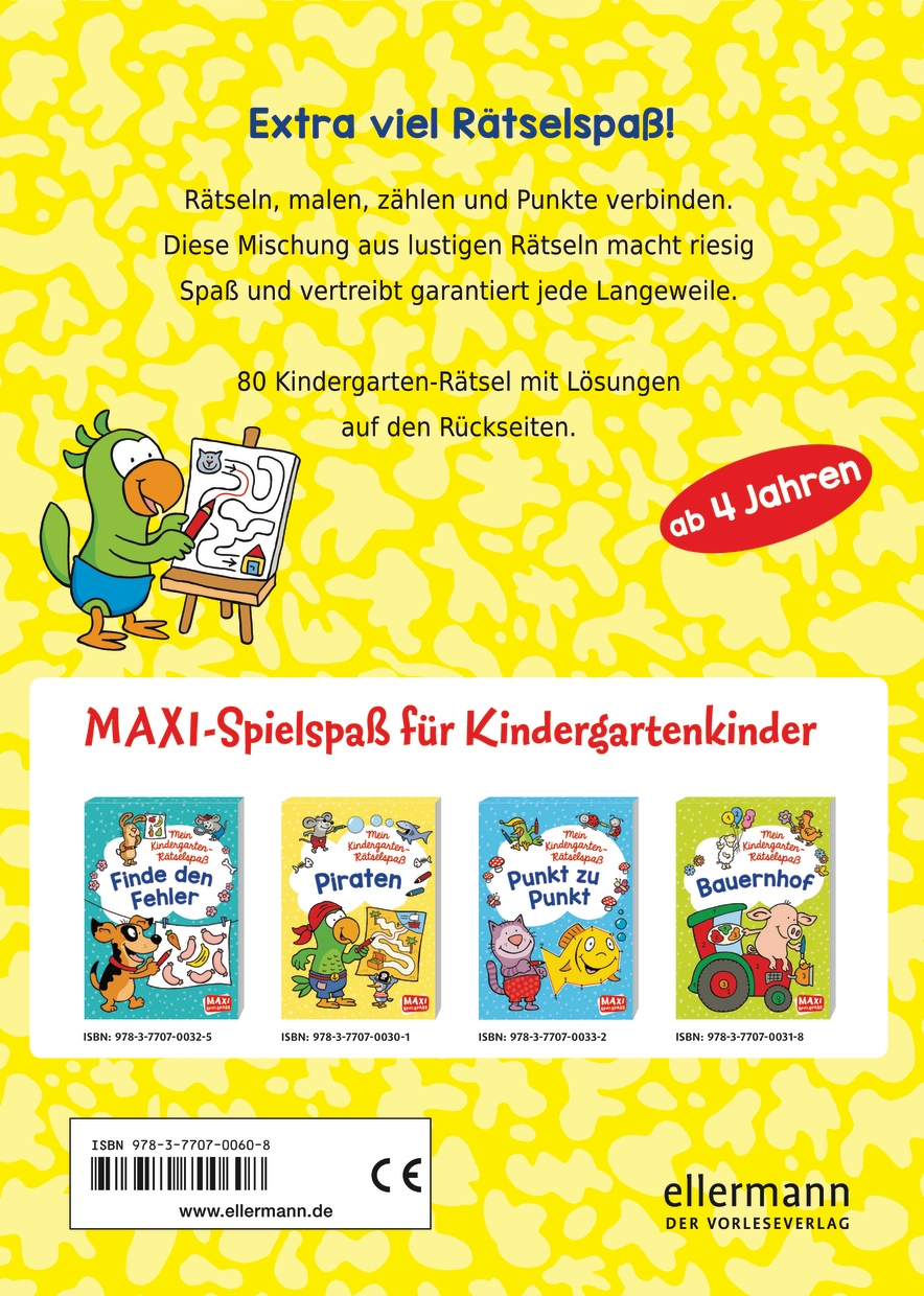 - Beschreibung Extra viel Rätselspaß! Rätseln, malen, zählen und verbinden. Diese Mischung aus lustigen Rätseln macht riesig Spaß und vertreibt garantiert jede Langeweile. 80 MAXI-Kindergarten-Rätsel auf 160 Seiten. Das richtige Ergebnis findet man (oder Kind) auf den Rückseiten. Praktisch, günstig und macht Spaß!