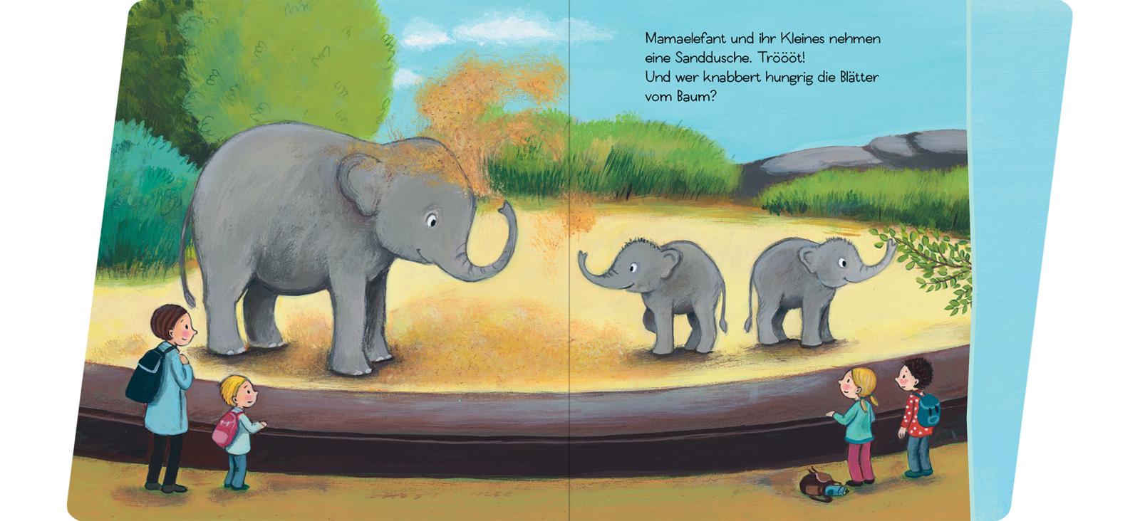 5 Doppelseiten zeigen die Lieblingstiere der Allerkleinsten: Ob im Zoo oder in der Natur, hier gibt es Katzen, Füchse, Elefanten, Igel, Enten und vieles mehr zu sehen. Begleitet wird jede Seite mit einem kurzen Erzähltext, der zum Entdecken einlädt und die Fantasie anregt.