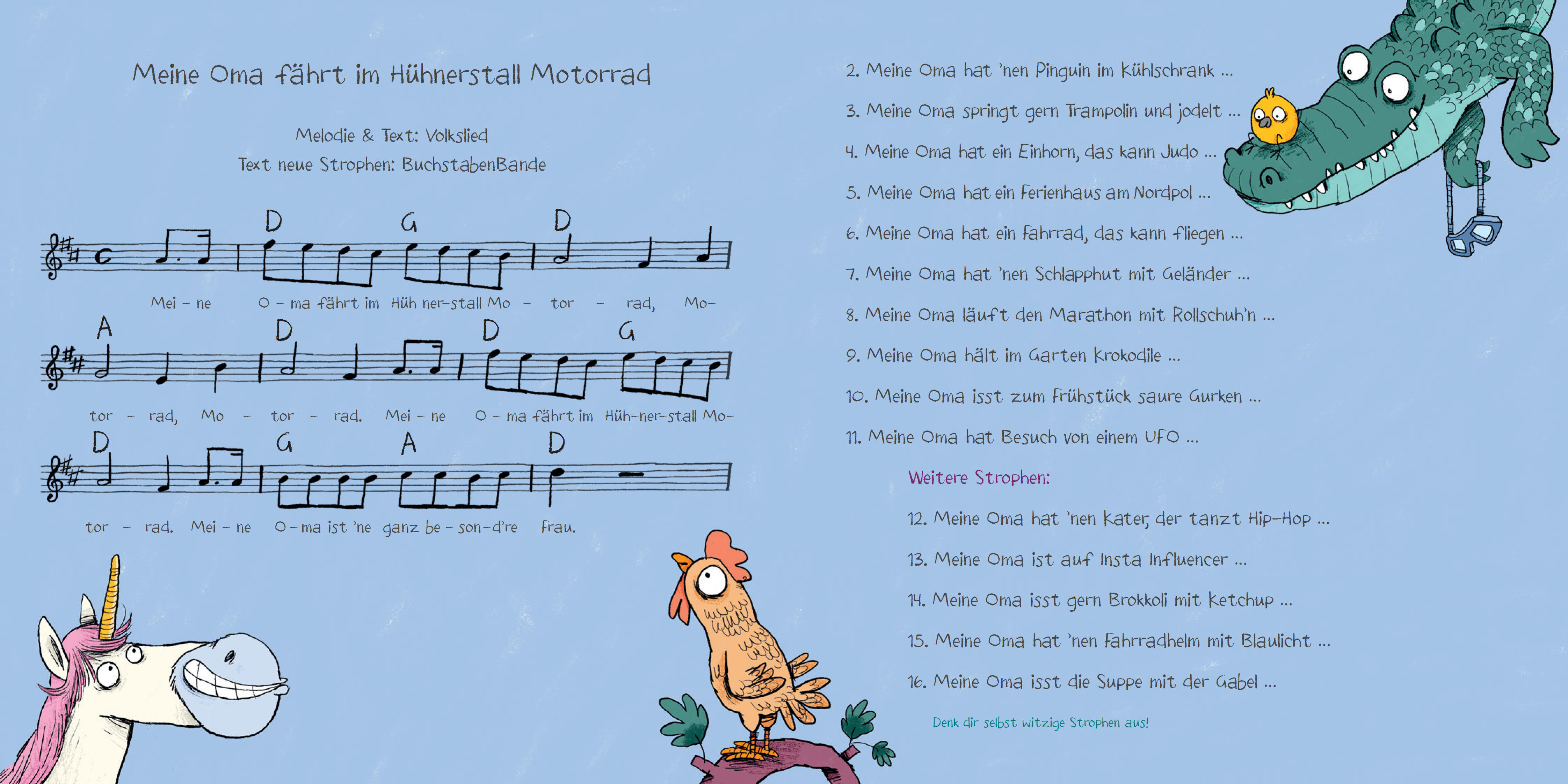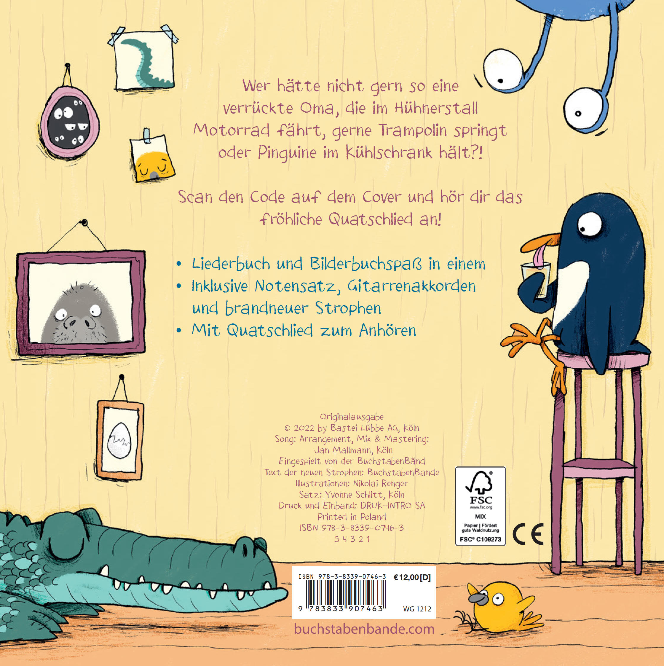 Wer kennt es nicht - das Quatschlied von der Oma, die mit ihrer heißen Kiste durch den Hühnerstall braust. Ein Klassiker, der in jeder Familie gesungen, geträllert oder laut mitgebrüllt wird. Nikolai Renger hat diesen zeitlosen Song mit einer Extraportion Witz und verrückten Details zum Entdecken und Staunen in Szene gesetzt. Als stabile Pappe mit Notensatz und Gitarrenbegleitung auf der letzten Seite wird es bestimmt zum Lieblingsbuch für die ganze Familie. Und wer die Melodie vergessen hat, der scannt den QR-Code und hört sich das frisch eingespielte Lied inklusive neuer Strophen einfach noch mal an. Achtung: Ohrwurm garantiert!