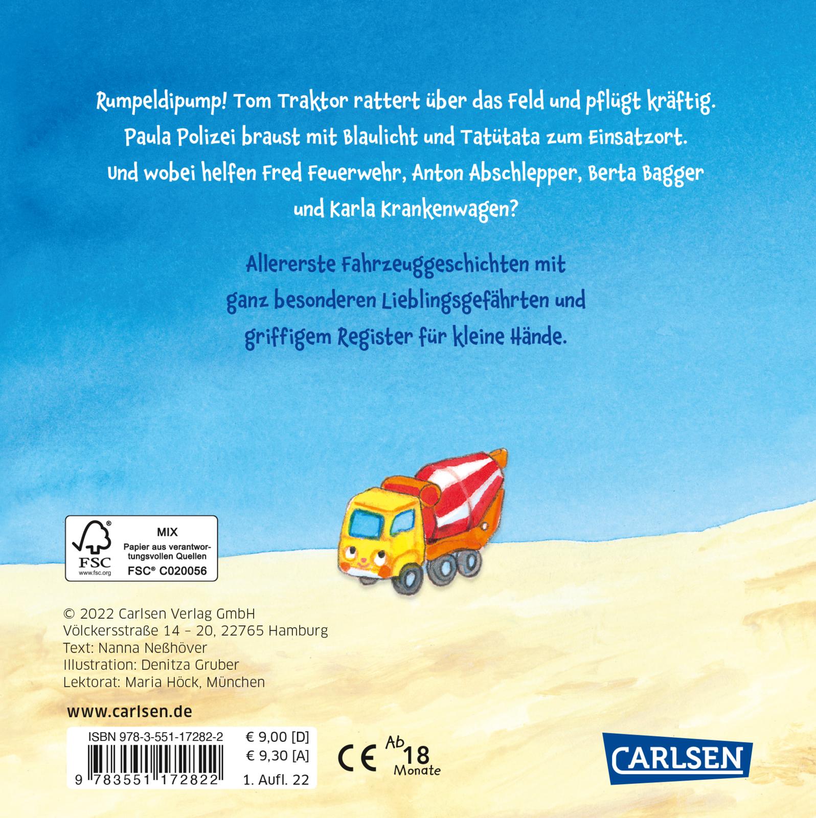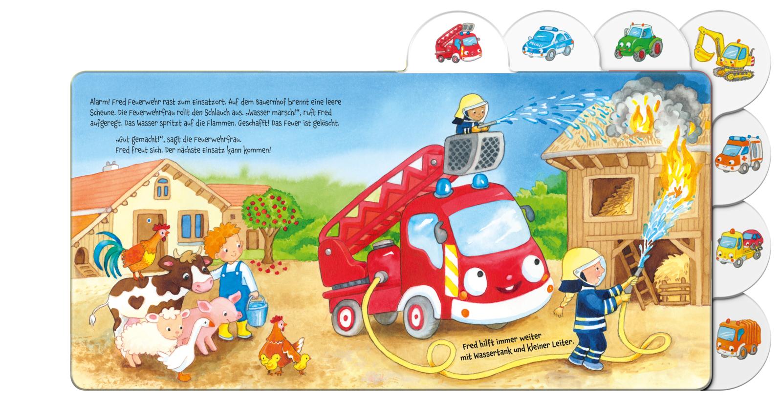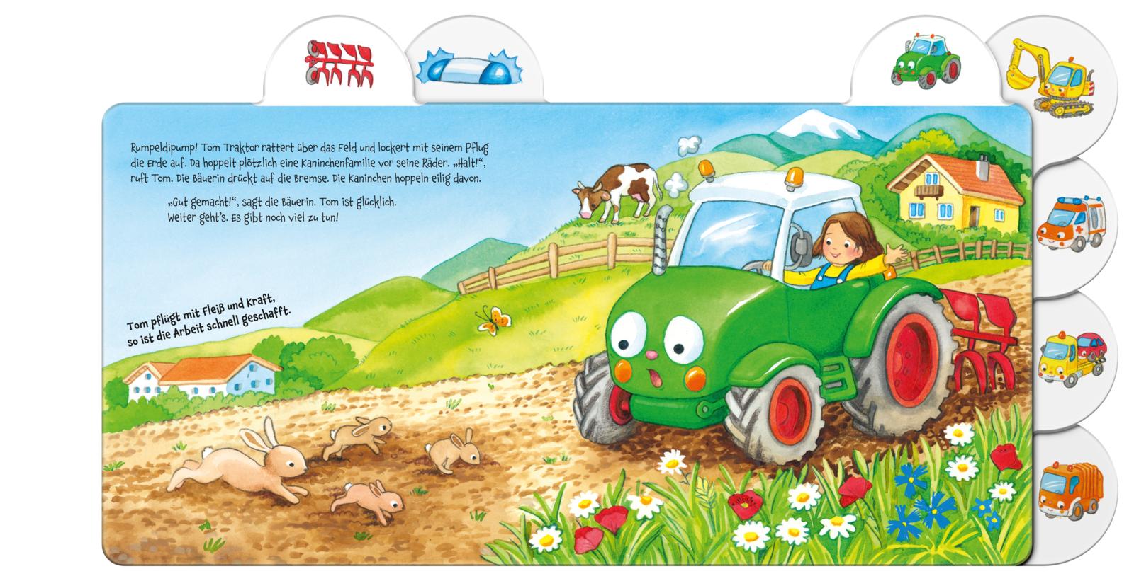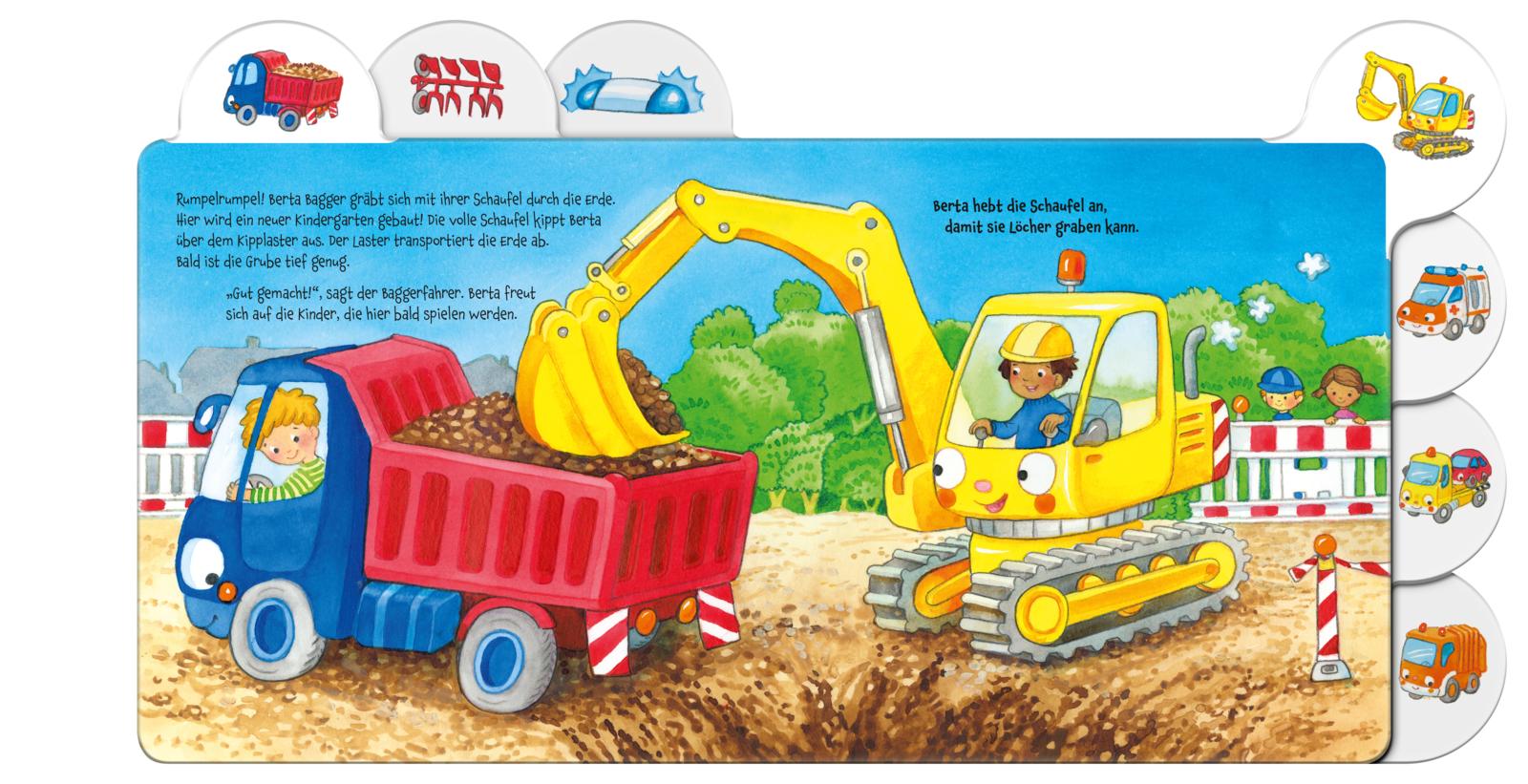 Die kurzen Texte erzählen von verschiedenen Situationen, zum Beispiel auf dem Bauernhof, der Baustelle und im Straßenverkehr und zeigen wie die Fahrzeuge helfen. Das seitliche stabile Register lässt die Kleinen schnell ihr Lieblingsfahrzeug finden.