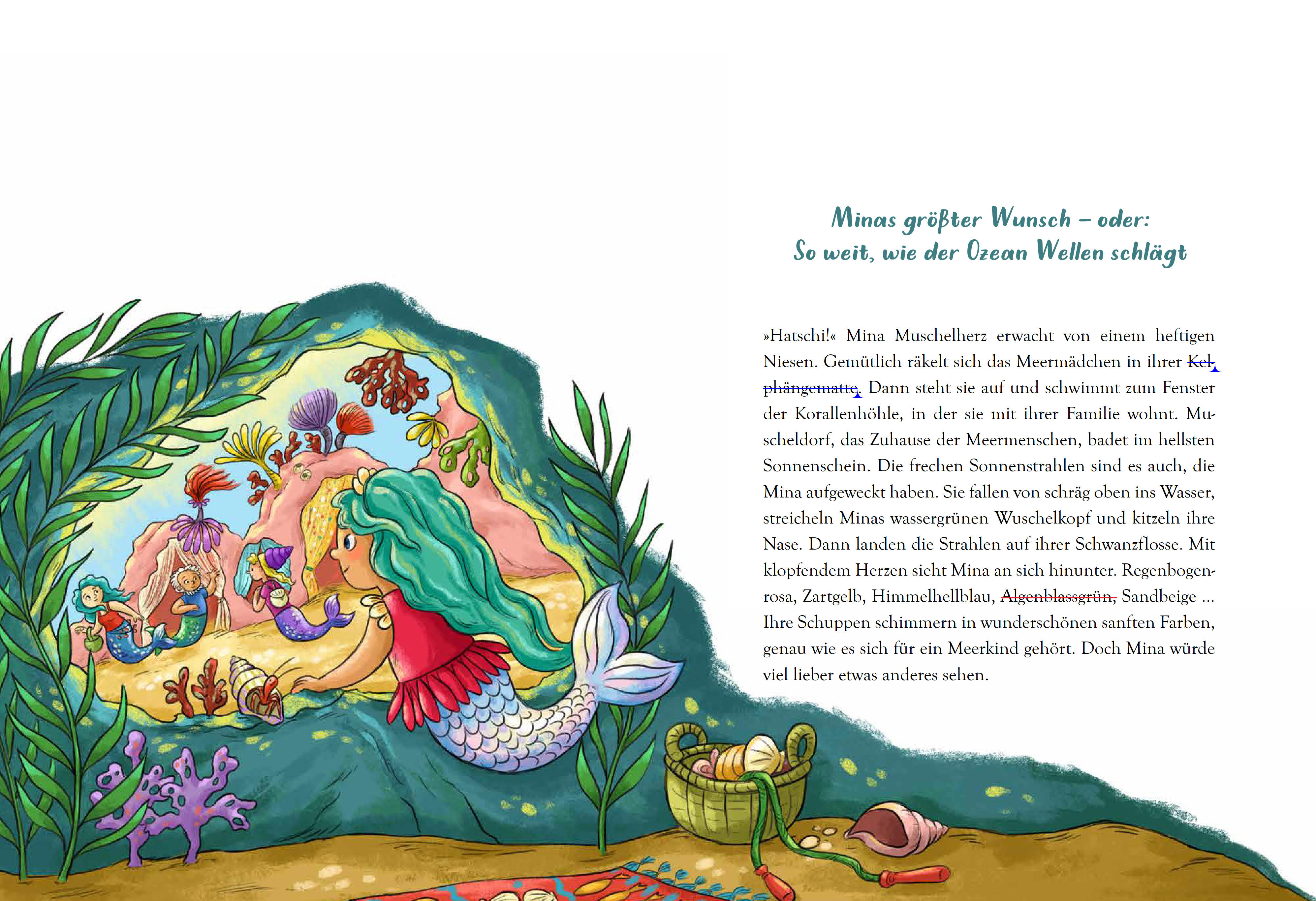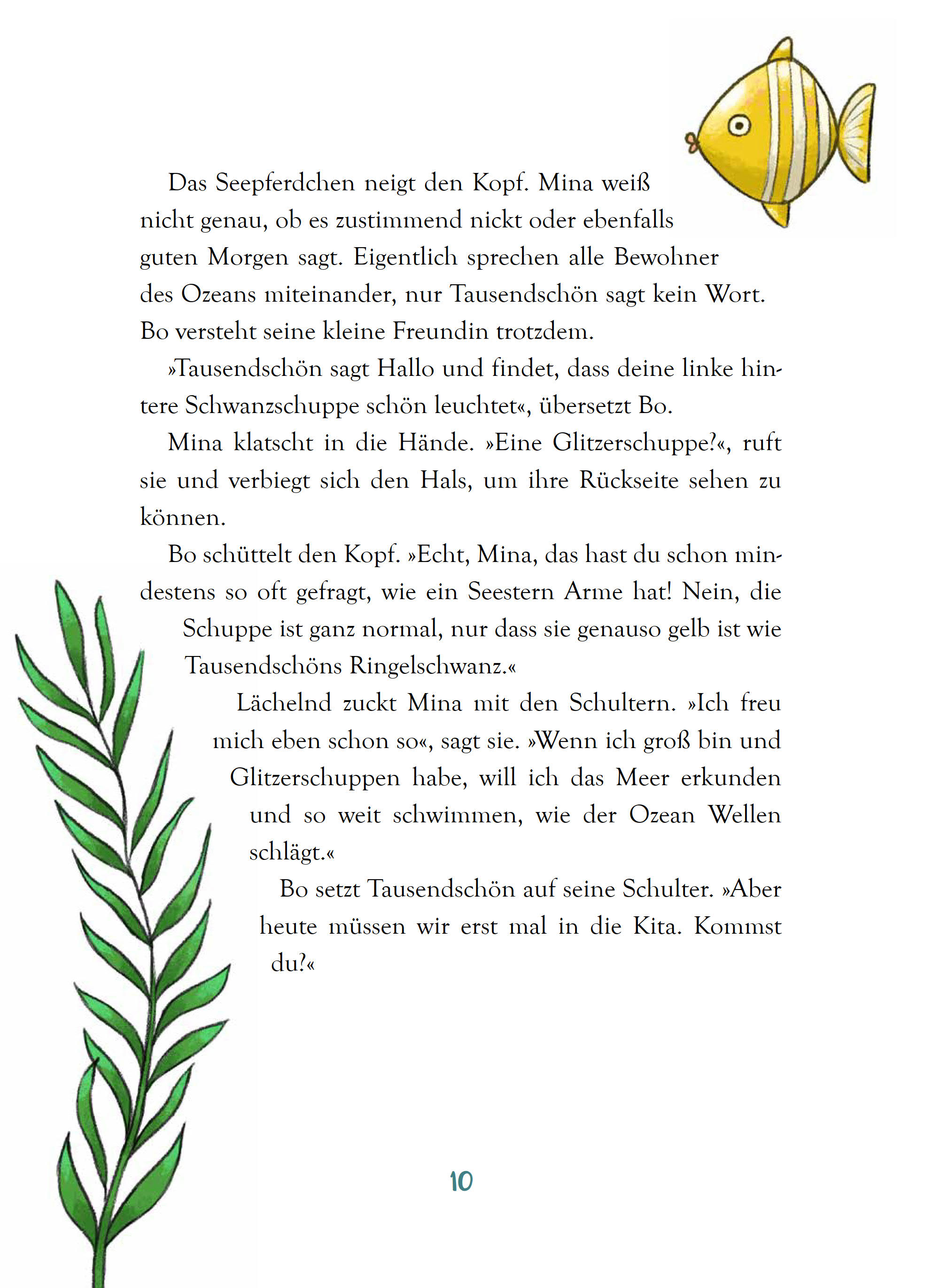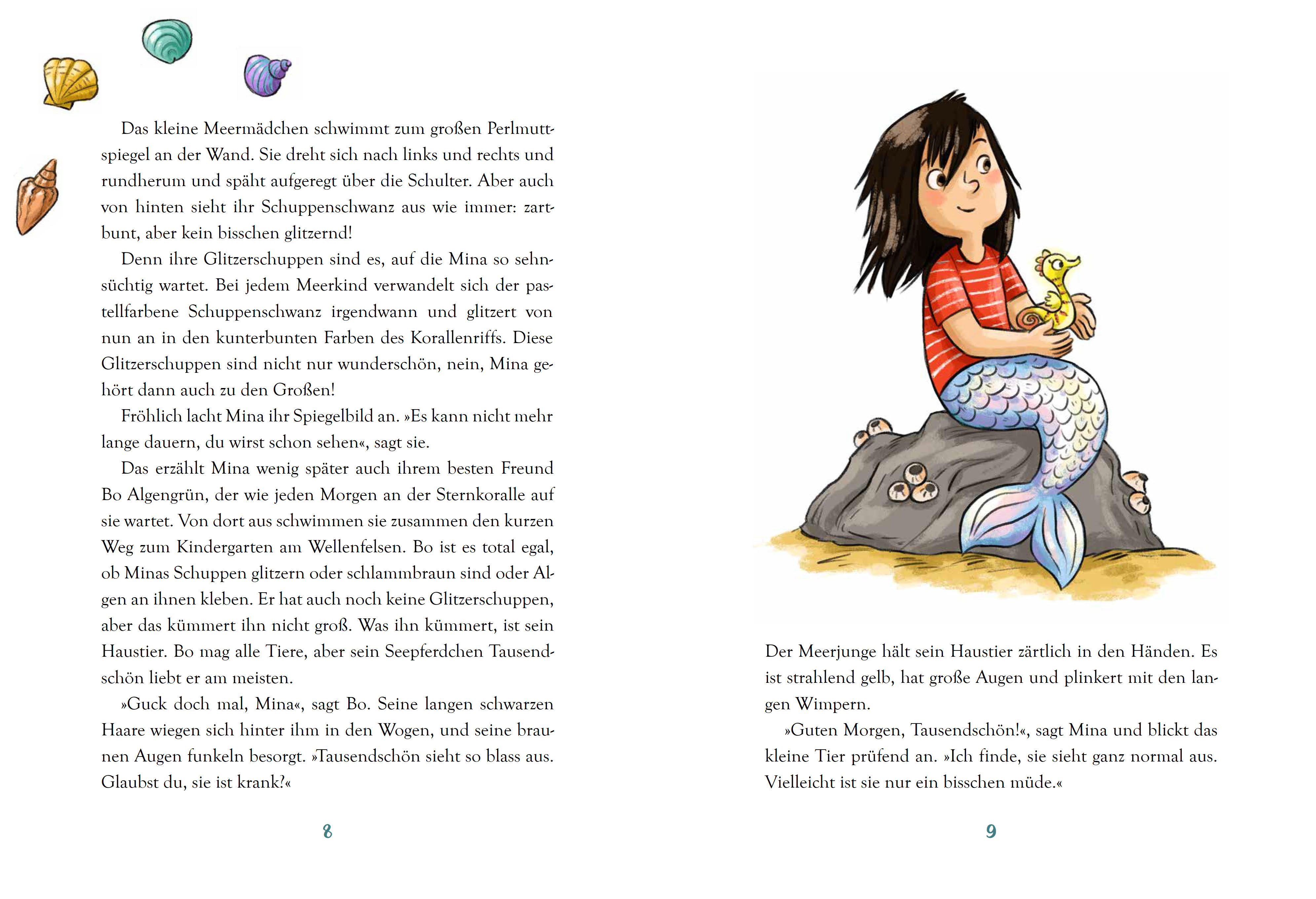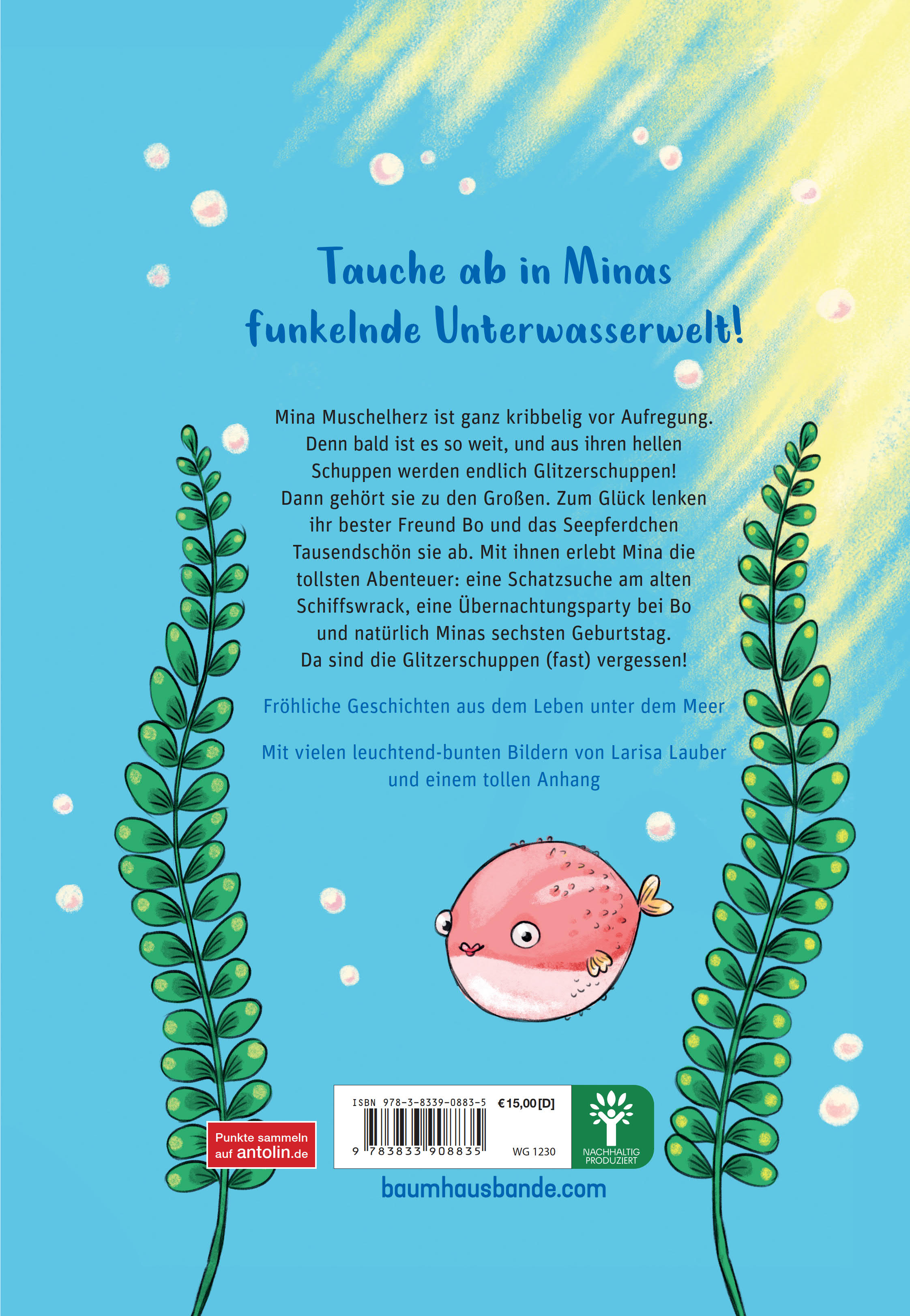 Mina Muschelherz ist ganz kribbelig vor Aufregung. Denn bald werden aus ihren hellen Schuppen endlich Glitzerschuppen! Zum Glück lenken ihr bester Freund Bo und das Seepferdchen Tausendschön sie ab. Mit ihnen erlebt Mina die tollsten Abenteuer: eine Schatzsuche am alten Schiffswrack, eine Übernachtungsparty bei Bo und natürlich Minas sechsten Geburtstag. Da sind die Glitzerschuppen (fast) vergessen!