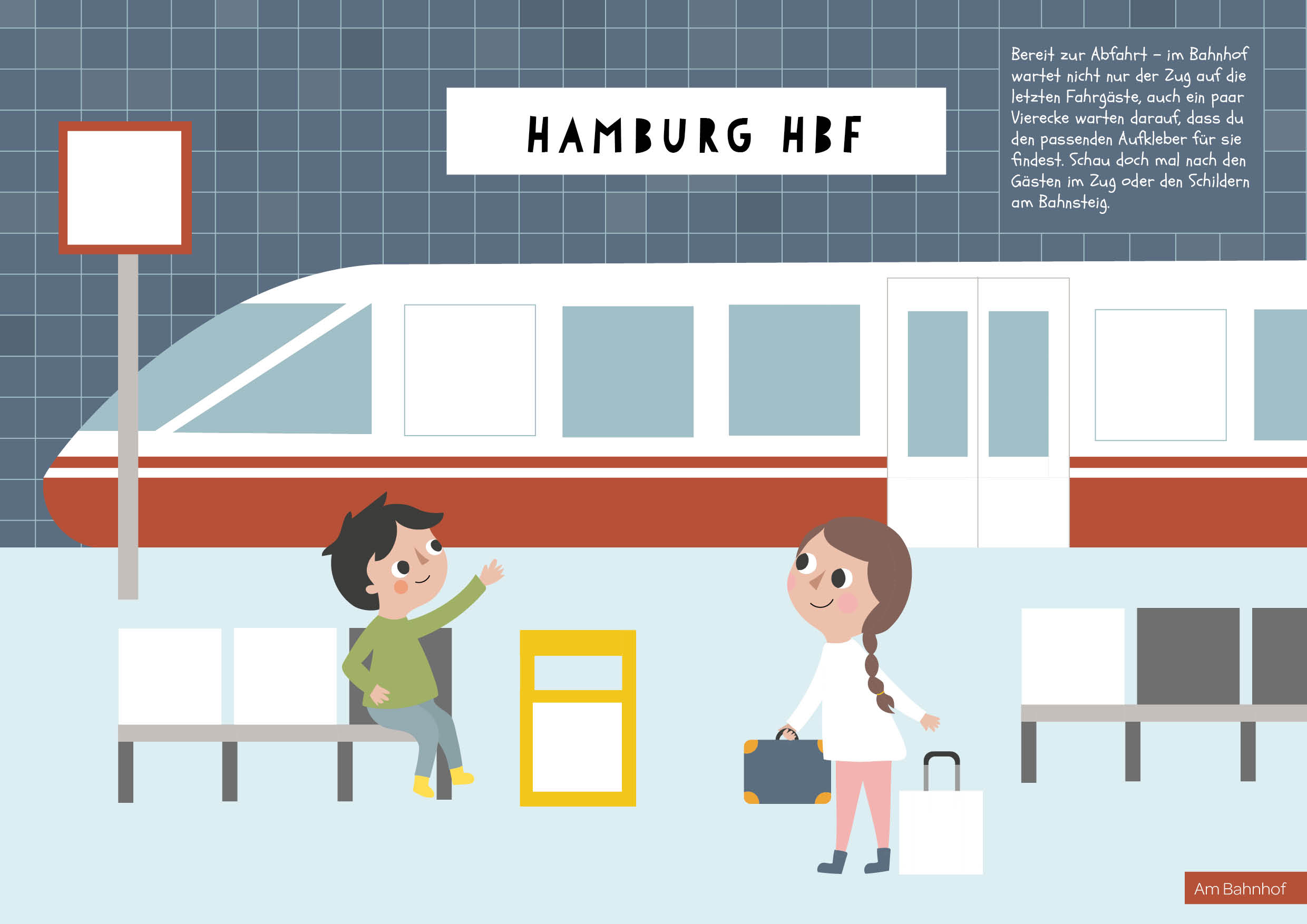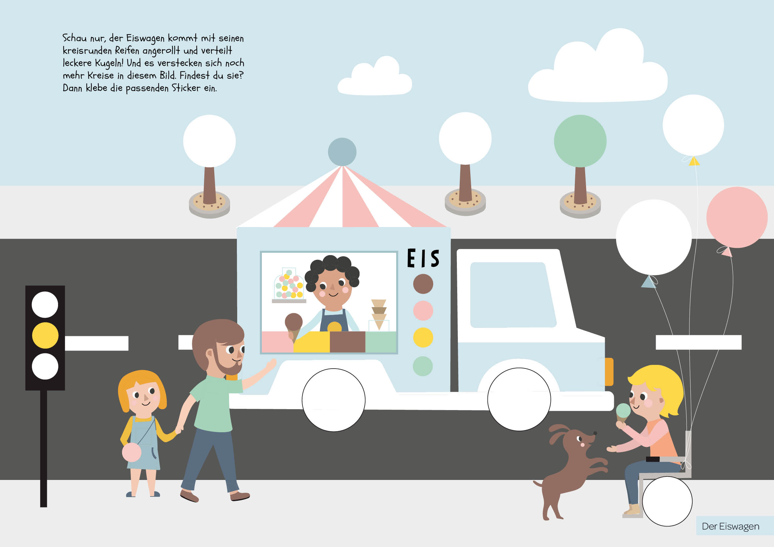 Kinderleicht und spielerisch: kunterbunte Szenen mit weißen Aussparungen, in die die passenden Formen-Sticker geklebt werden können