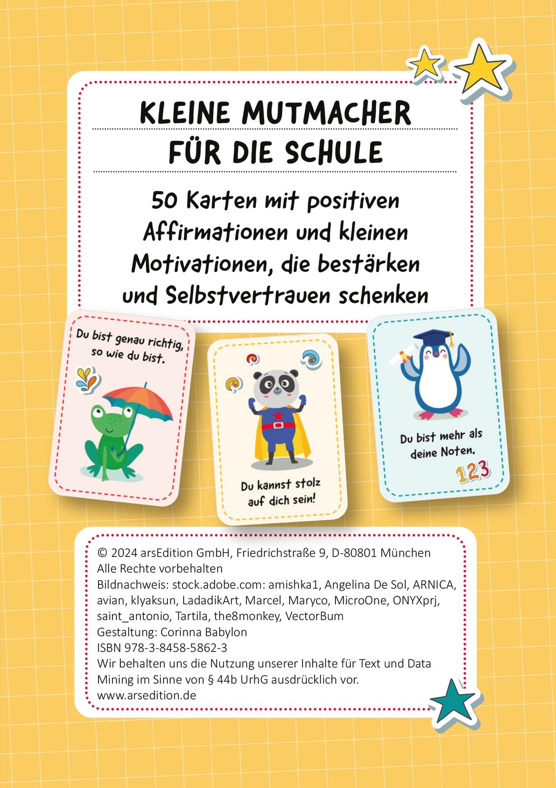 In dieser bunt gestalteten Kartenbox befinden sich 50 Mutmachkarten für Kinder. Die positiven Botschaften und Affirmationen schenken Mut, stärken das Selbstvertrauen und helfen Kindern dabei, mit schwierigen Situationen im Alltag umzugehen und Selbstvertrauen zu entwickeln. Perfekt geeignet als Mutmacher für den Schulstart, aber auch für andere Situationen, wie den Eintritt in den Kindergarten, einen aufregenden Auftritt, einen Umzug etc.