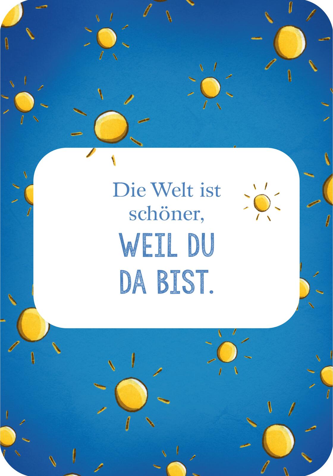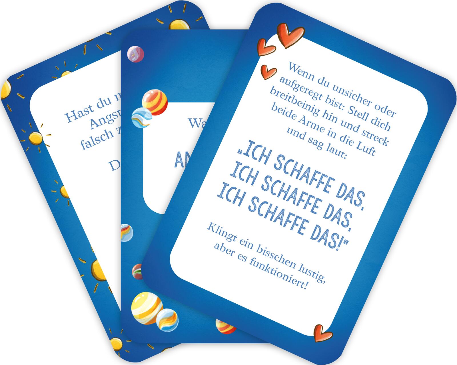 In dieser liebevoll gestalteten Kartenbox befinden sich 50 Affirmationskarten für Kinder. Perfekt geeignet als Mutmacher für den Schulstart, aber auch für andere Situationen, wie den Eintritt in den Kindergarten, einen aufregenden Auftritt, einen Umzug etc.