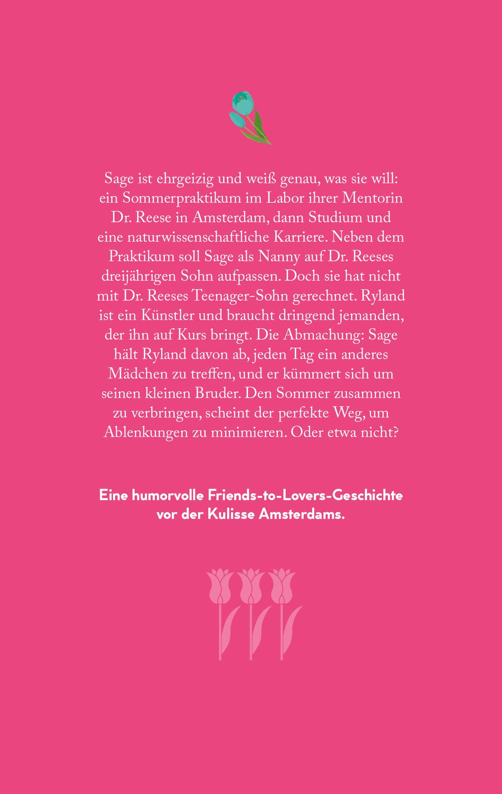 Sage ist ehrgeizig und sie weiß genau, was sie will. Ihr Ziel: ein Sommerpraktikum im Labor ihrer Mentorin Dr. Reese in Amsterdam, dann Studium, dann eine naturwissenschaftliche Karriere. Neben dem Praktikum soll Sage in Amsterdam als Nanny auf Dr. Reeses 3-jährigen Sohn aufpassen. Aber sie hat nicht mit Dr. Reeses Teenager-Sohn gerechnet. Ryland ist ein Künstler und er braucht dringend jemanden, der ihn auf Kurs bringt. Die beiden treffen eine Abmachung: Sage soll Ryland davon abhalten, jeden Tag mit einem anderen Mädchen auszugehen, und Ryland soll sich um seinen kleinen Bruder kümmern. Den ganzen Sommer zusammen zu verbringen, ist der perfekte Weg, um die Ablenkungen auf ein Minimum zu reduzieren. Oder etwa nicht?