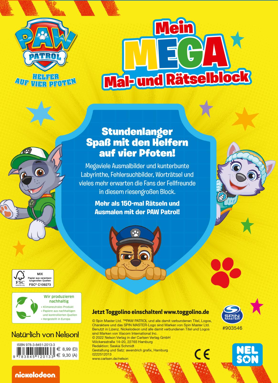 - Beschreibung Stundenlang Ausmalen und Rätseln mit der PAW Patrol!Die PAW Patrol ist unterwegs in der Abenteuerbucht und spielt mit ihren Drachen, skatet durch den Park und macht sich dann bereit für ihren nächsten Einsatz - hilf ihnen dabei!MEGA viele Ausmalbilder und kunterbunte Labyrinthe, Fehlersuchbilder, Worträtsel und vieles mehr erwarten die Fans der Fellfreunde in diesem riesengroßen Block. In diesem kunterbunten Block warten mehr als 150 PAWtastische Malbilder und knifflige Rätsel darauf, von PAW-Patrol-Fans ab 3 Jahren ausgemalt und gelöst zu werden und fördern spielerisch Feinmotorik, Kreativität und logisches Denken.