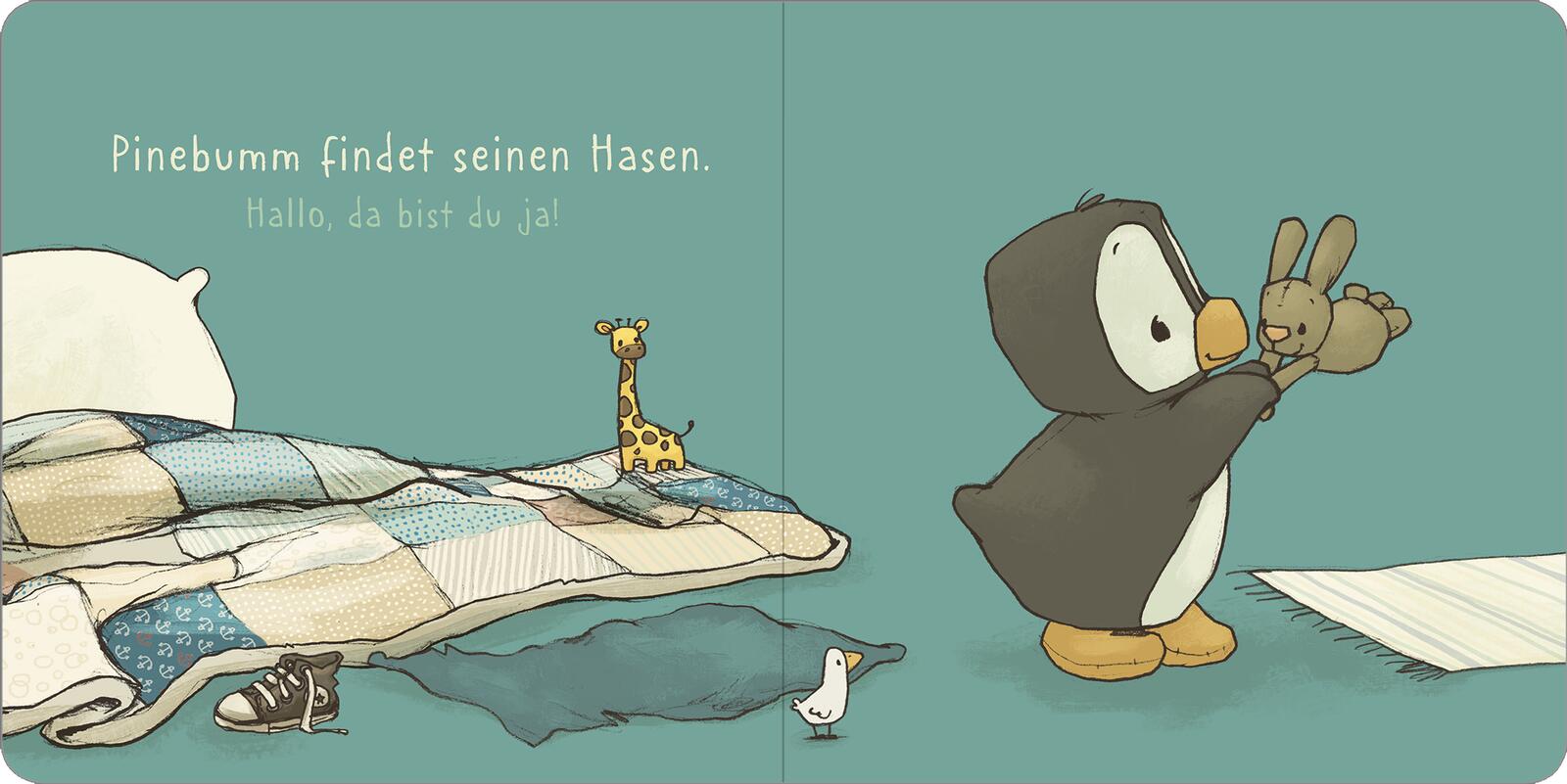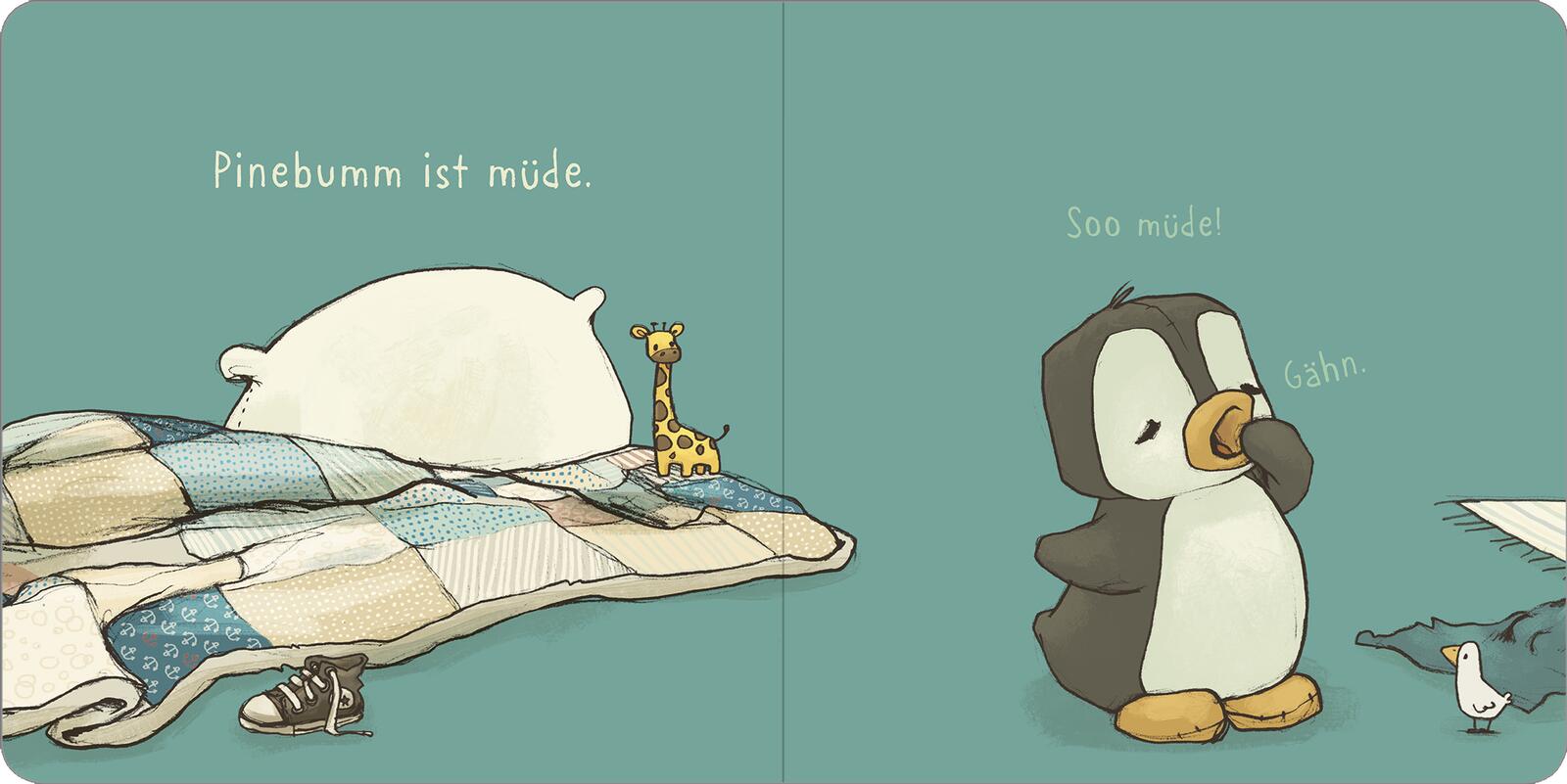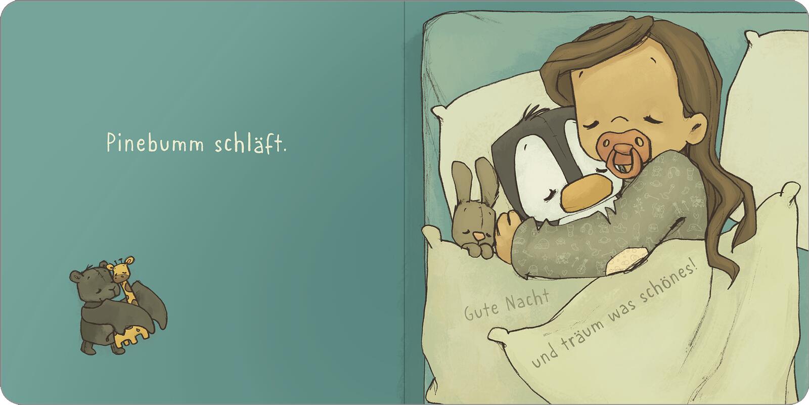 Pinebumm, der kleine Pinguin, ist müde. Soo müde! Zuerst sucht er seinen Kuschelhasen, dann schmiegt er sich in sein warmes Bett. Und was braucht Pinebumm zum Einschlafen natürlich noch unbedingt? Richtig - einen dicken Kuss von Anouk!