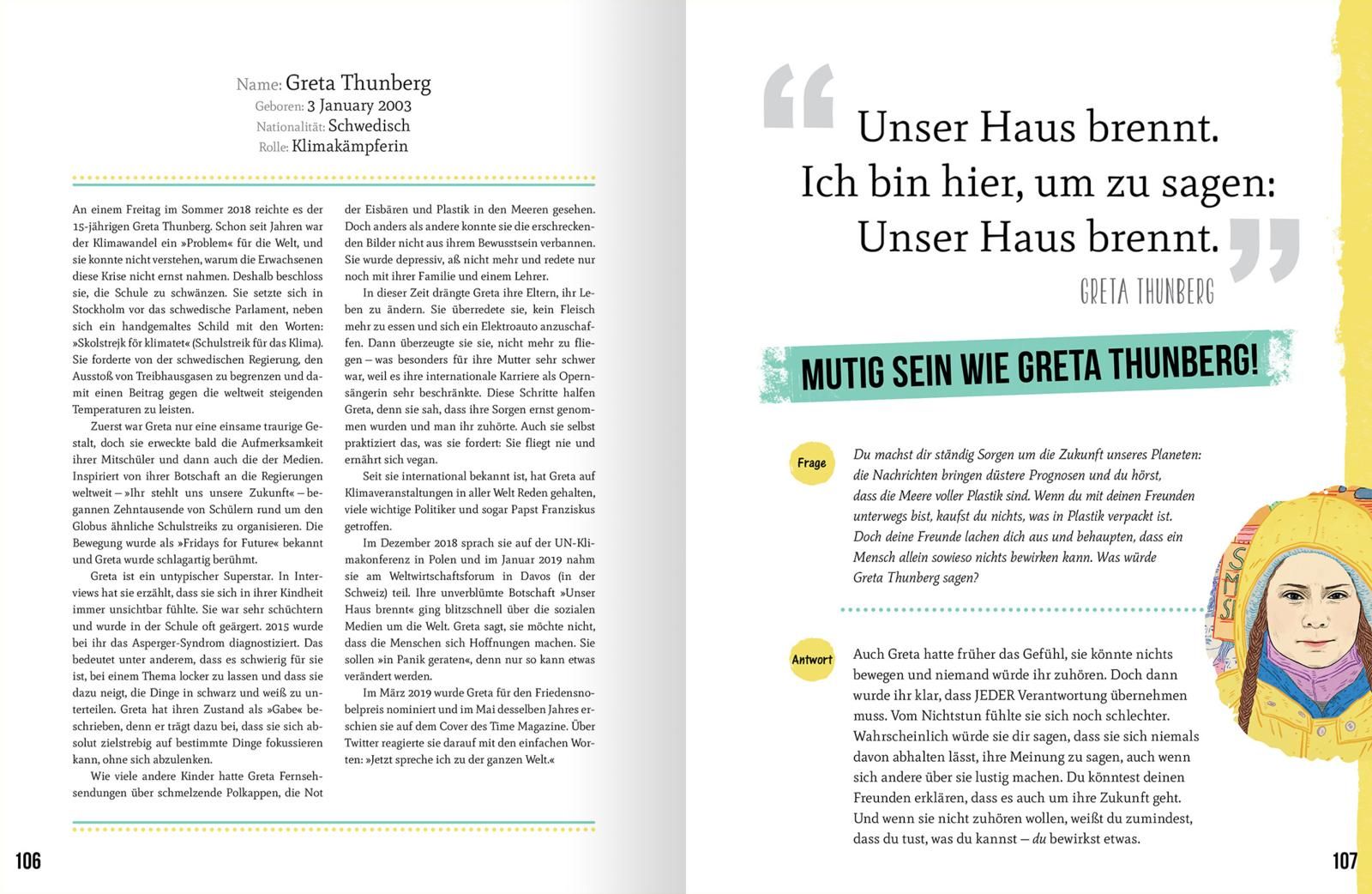 Die mutigen Jugendlichen kommen aus der ganzen Welt: wie z.B. Greta Thunberg, Klimaaktivistin, die 2018 den Schulstreik für das Klima startete; Alexandra Scott, Krebsaktivistin, sammelte bereits im Alter von vier Jahren Geld für die Krebsforschung; Felix Finkbeiner, Umweltschützer, gründete 2007 Plant-for-the-Planet, um das Bewusstsein für Klimawandel und globale Gerechtigkeit zu wecken; Malala Yousafzai, Bildungsaktivistin, die sich für das Recht von Mädchen auf Lernen einsetzt; Emma González, Befürworterin für schärfere Waffengesetze in den USA; Iqbal Masih, Kinderrechtler, der gegen Kinderarbeit kämpfte, und viele mehr