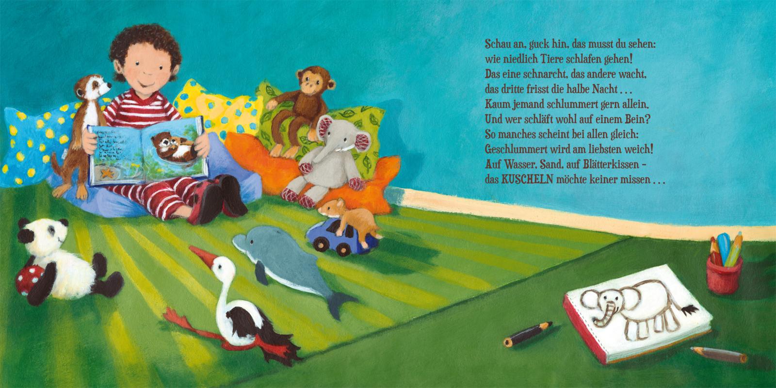 - Beschreibung Mit diesem Gutenachtbuch finden kleine Leser bestimmt leichter in den Schlaf, denn die Tierkinder machen es vor und jedes auf seine ganz besondere ihm typische Art: Der kleine Otter treibt beim Schlafen auf dem Wasser und hält sich an Mamas Pfoten fest. Die Erdmännchen schlummern am liebsten dicht an dicht und die Affen bauen sich ein weiches Blätternest im Baum. Lustige Reime zu vielen liebenswerten Tierkindern begleiten müde, kleine Leser in den Schlaf.