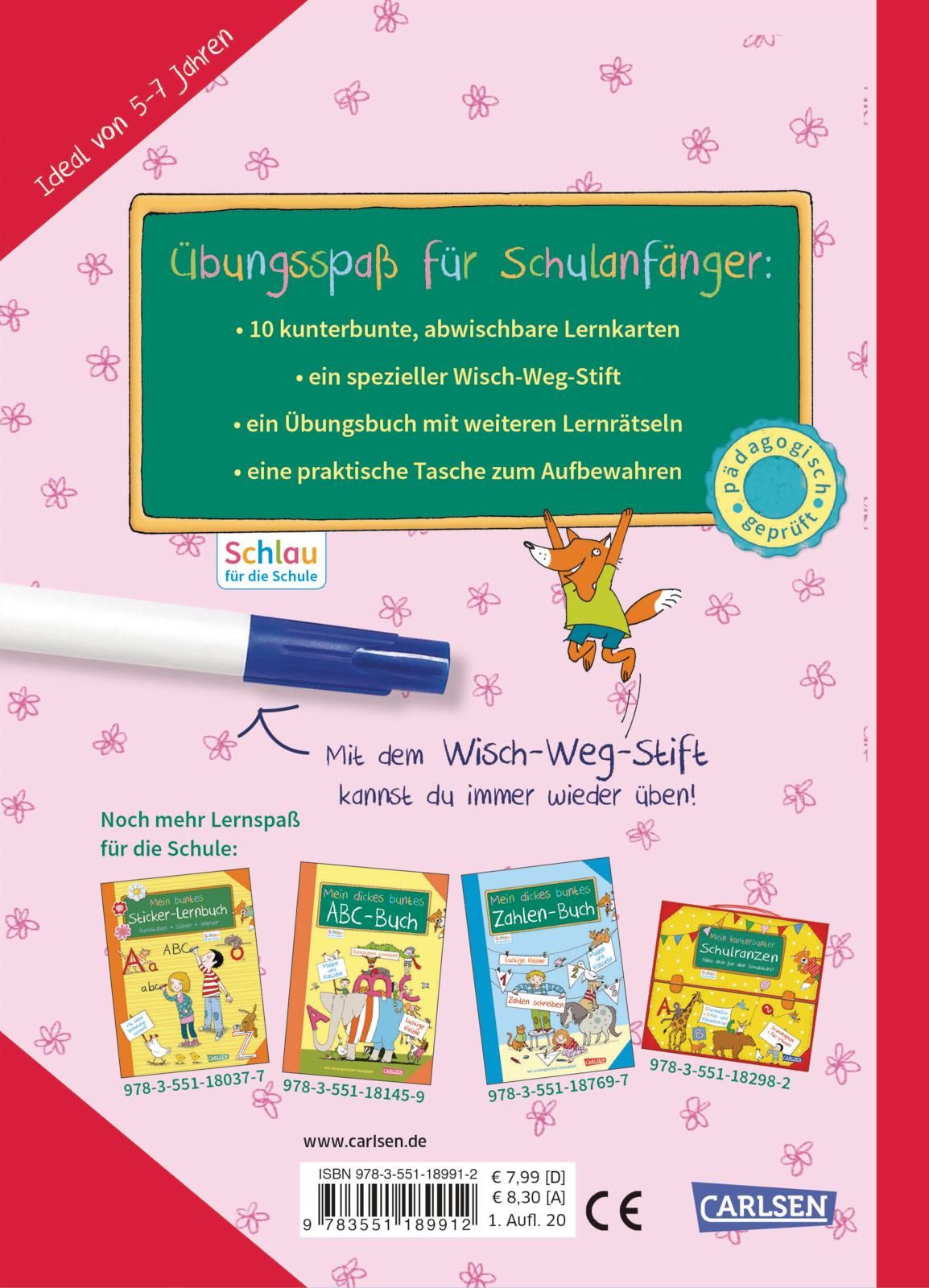 Großer Übungsspaß für Schulanfänger: 10 kunterbunte, abwischbare Lernkarten, ein spezieller Wisch-Weg-Stift, ein Übungsbuch und eine praktische Tasche zum Aufbewahren. Alles drin in einem Set!