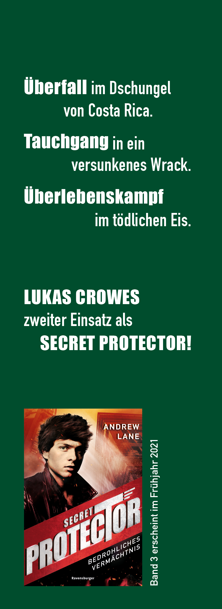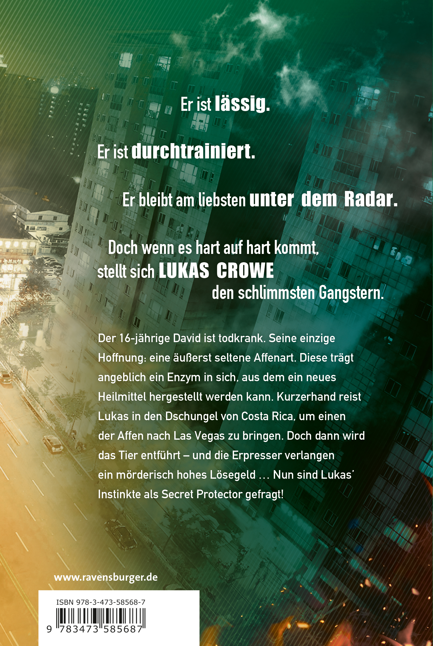 Der 16-jährige David ist todkrank. Seine einzige Hoffnung: eine äußerst seltene Affenart. Diese trägt angeblich ein Enzym in sich, aus dem ein neues Heilmittel hergestellt werden kann. Kurzerhand reist Lukas in den Dschungel von Costa Rica, um einen der Affen nach Las Vegas zu bringen. Doch dann wird das Tier entführt – und die Erpresser verlangen ein mörderisch hohes Lösegeld … Nun sind Lukas’ Instinkte als Secret Protector gefragt!
