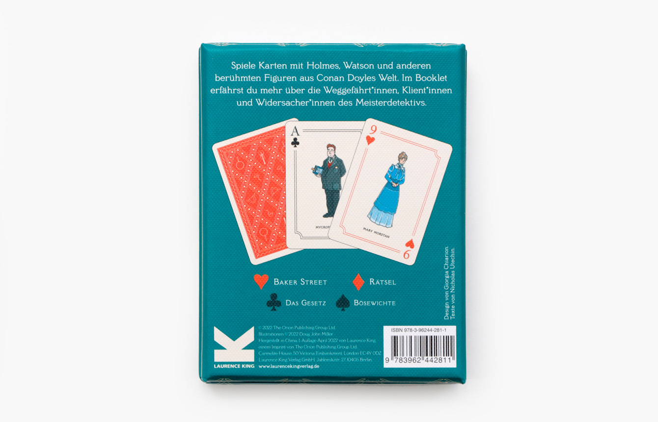 Spielen Sie Ihre liebsten Kartenspiele mit Holmes, Watson und anderen berühmten Figuren aus Conan Doyles Welt des Meisterdetektivs. Im beiliegenden Booklet erfahren Sie mehr über die Weggefährt*innen, Klient*innen und Widersacher*innen des Meisterdetektivs. Ein großes Vergnügen für Sherlock Holmes-Fans und alle, die es werden möchten!