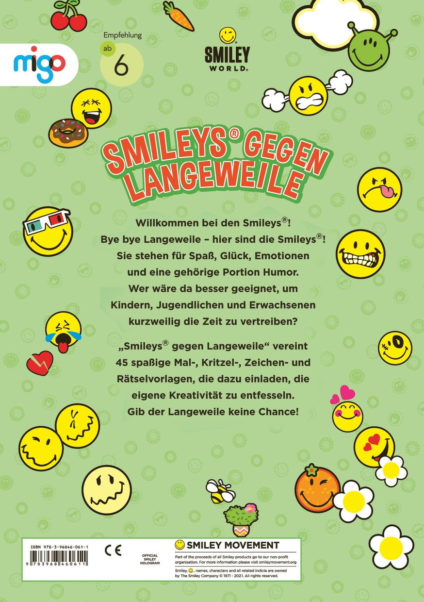 Mit den Smileys® gegen Langeweile! Die bei Klein und Groß beliebten Smileys® werden 50 Jahre alt. Sie stehen für Spaß, Glück, Emotionen und eine gehörige Portion Humor. Wer wäre da besser geeignet, um Kindern und auch Erwachsenen kurzweilig die Zeit zu vertreiben? „Smileys® gegen Langeweile“ vereint rund 50 Ausmal- und Rätselvorlagen, die kreativ, abwechslungsreich und nach eigenen Vorlieben bemalt werden können. Und so verschieden die einzelnen Smileys® sind, so unterschiedlich sind auch die kreativen Herausforderungen.