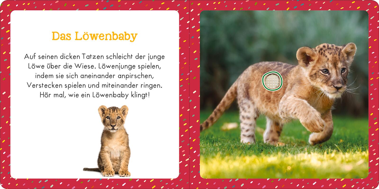 Auf jeder Doppelseite wird ein Lieblingstier mit hochwertigen Fotos und einem einfachen Sachtext vorgestellt. Beim Drücken auf das Tier wird das passende Tiergeräusch ausgelöst. Das ist nicht nur spannend, sondern fördert auch die Hand-Auge-Koordination, die Lautbildung und das Sprechen. Das Soundbuch für Klitzekleine eignet sich für Kinder ab 1 Jahr.