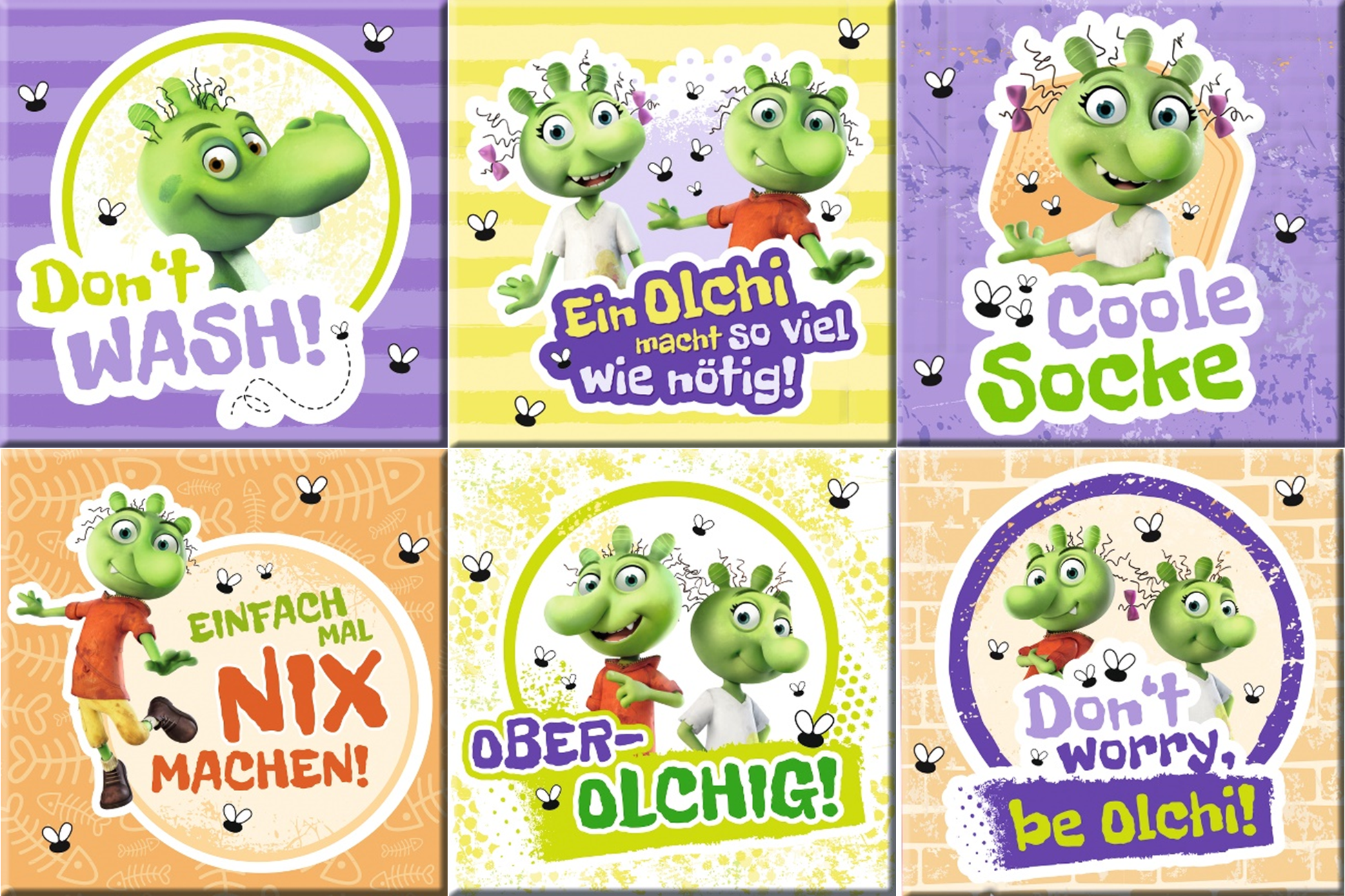 Magnet-Spaß mit den Olchis! Mit einem muffelfurzteuflischen "Ober-olchig!" können kleine Notizen, Hinweise oder Erinnerungen ganz einfach an Edelstahlkühlschränken, Dunstabzugshauben, Memo-Boards oder anderen magnetische Flächen befestigt werden.