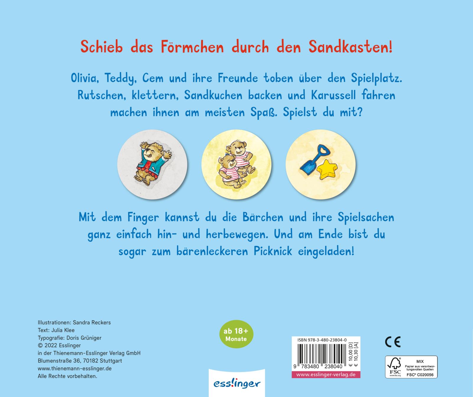 Komm mit! Auf dem Spielplatz gibt es für die Kleinsten jede Menge zu erleben: rutschen, klettern, Karussell fahren oder Sandkuchen backen. Davon können die Bärenkinder Olivia, Teddy, Sophie und Cem gar nicht genug bekommen. Auf jeder Doppelseite können Kinder ab 18 Monaten sie aktiv unterstützen und mithelfen. Ganz einfach lassen sich die kleinen Bären auf der Rutsche oder auf dem Klettergerüst mithilfe der großen Schiebe-Elemente hin und her schieben. Die Schiebeelemente sind so gestaltet, dass auch Kleinkinder sie selbstständig bewegen können.