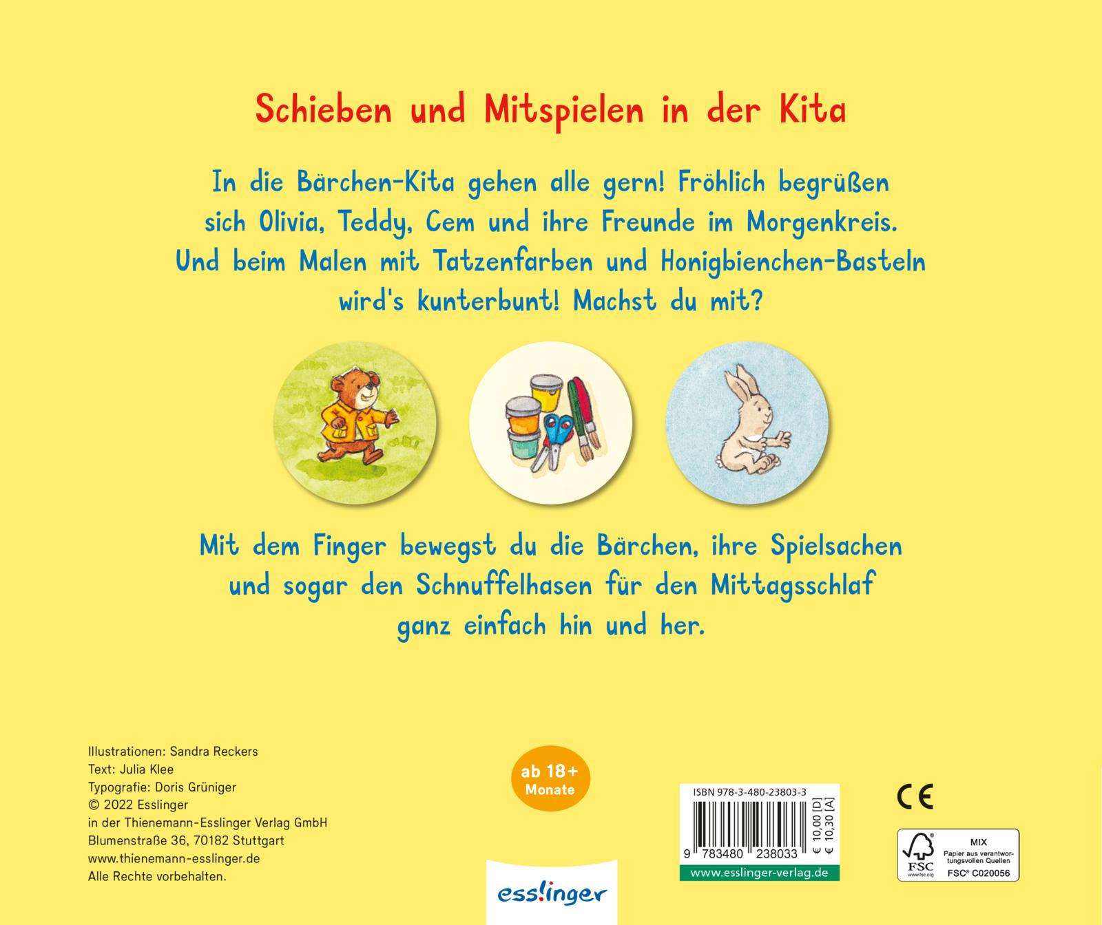 Komm mit! In der Kita ist jeder Tag ein Abenteuer! Fröhlich begrüßen sich die Bärenkinder im Morgenkreis, kunterbunt wird es beim Malen und Basteln mit Tatzenfarben und wenn zur Mittagszeit die Bäuchlein brummeln, wartet ein leckeres Essen. Auf jeder Doppelseite können Kinder ab 18 Monaten Olivia, Teddy, Sophie und Cem unterstützen und den Tag in der Kita aktiv miterleben. Ganz einfach lassen sich die Bären, ihre Spielsachen und sogar das Schnuffeltuch für den Mittagsschlaf mithilfe der großen Schiebe-Elemente ganz einfach hin- und herbewegen. Die Schiebeelemente sind so gestaltet, dass auch Kleinkinder sie selbstständig bewegen können.