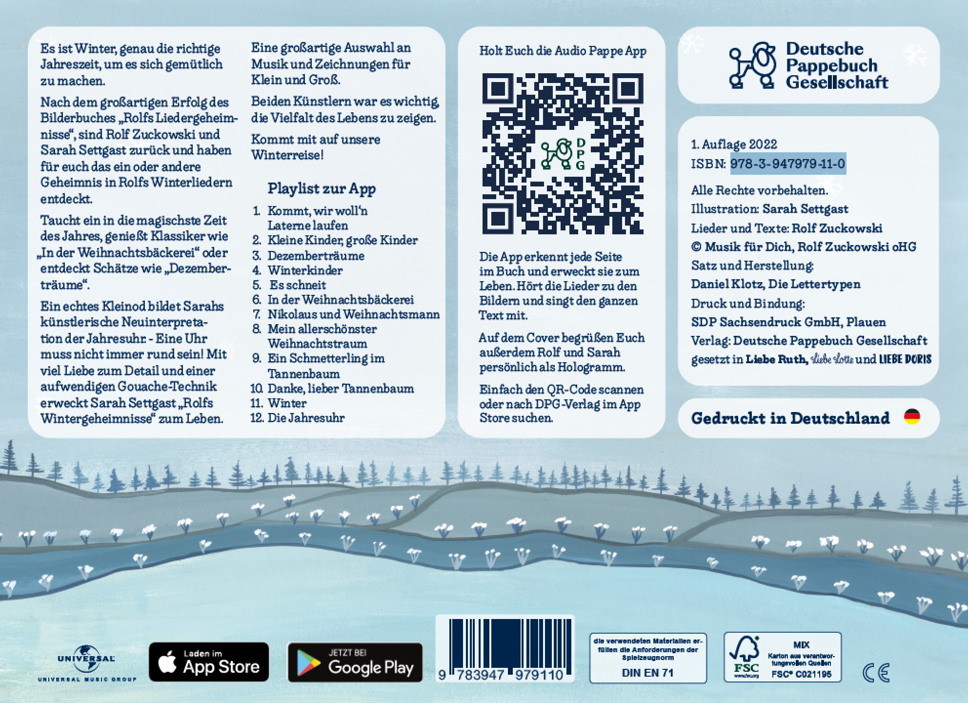 Beiden Künstlern war es wichtig, die Vielfalt des Lebens zu zeigen.Kommt mit auf unsere Winterreise! Das Buch enthält noch einige Geheimnisse, die Ihr über die neue Audio-Pappe App erleben könnt: Mit der App zum Buch bringt Ihr jede Seite im Buch zum Klingen. Hört die Lieder zu den Bildern und singt den ganzen Text mit. Auf dem Cover erwartet euch eine Überraschung. Einfach den QR-Code auf dem Buch scannen und die App aufs Handy laden.