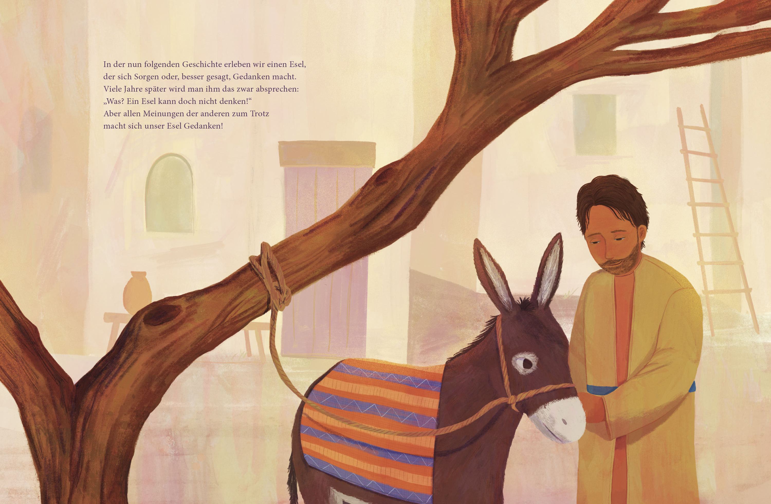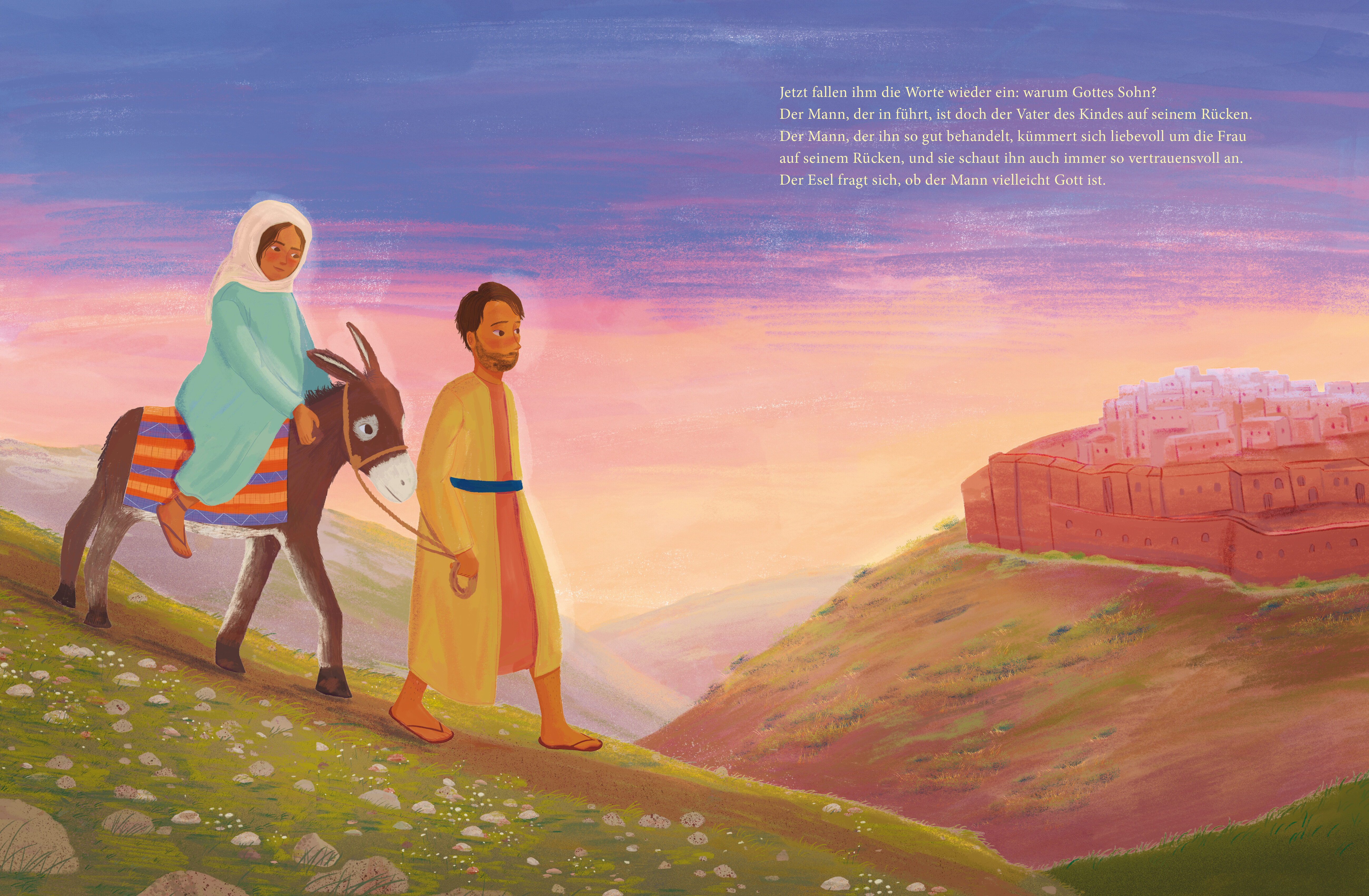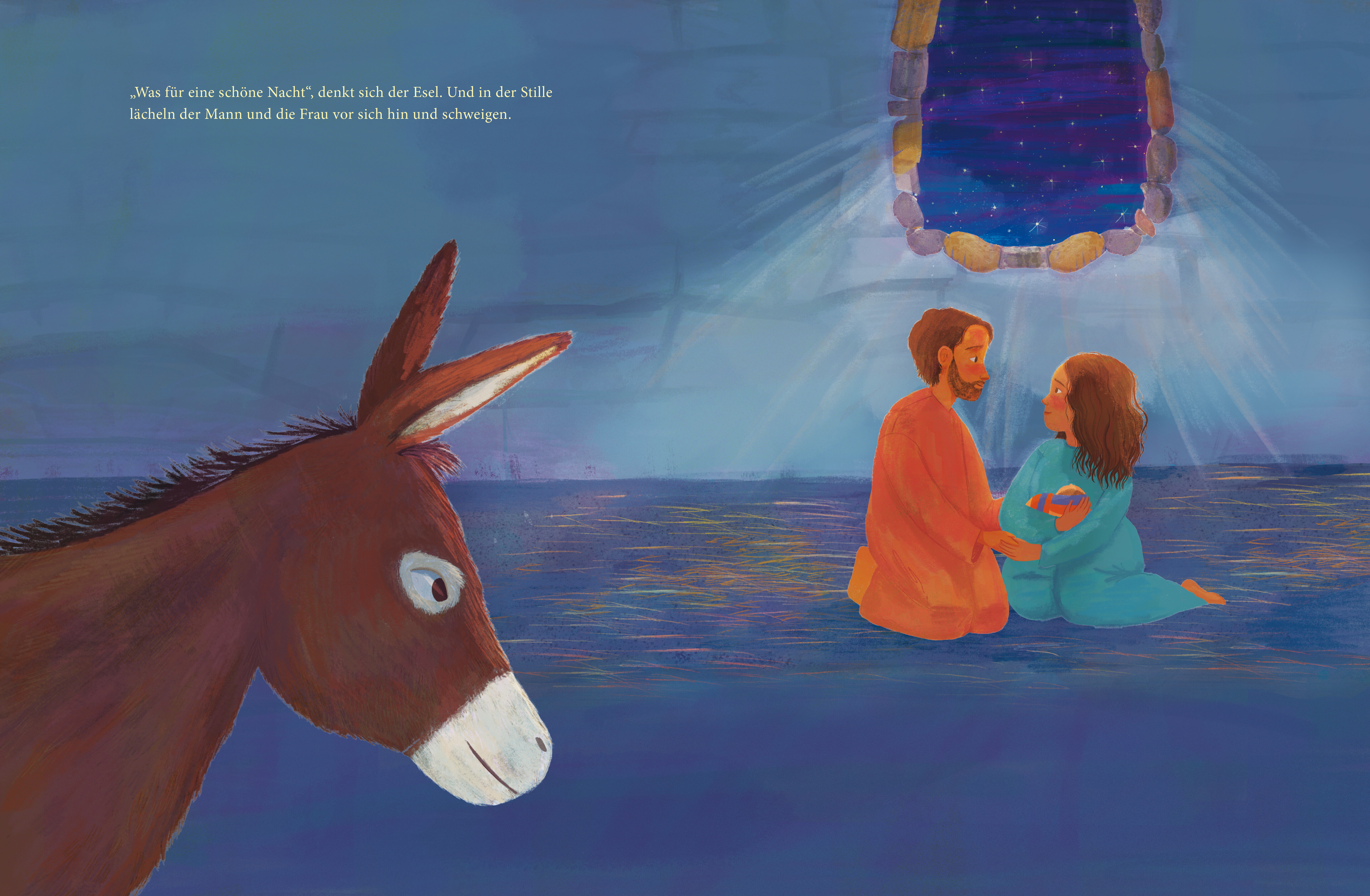 Einmal, vor langer Zeit, mussten ein Mann und seine hochschwangere Frau einen weiten Weg zurücklegen. Auf dieser Reise begleitet sie ein treuer, nachdenklicher Esel, der vorsichtig einen Huf vor den anderen setzt und sie so sicher ans Ziel bringt. Und in einer stillen Nacht geschieht es dann: Ein Kind wird geboren, und der Esel erlebt den Zauber der ersten Weihnacht.