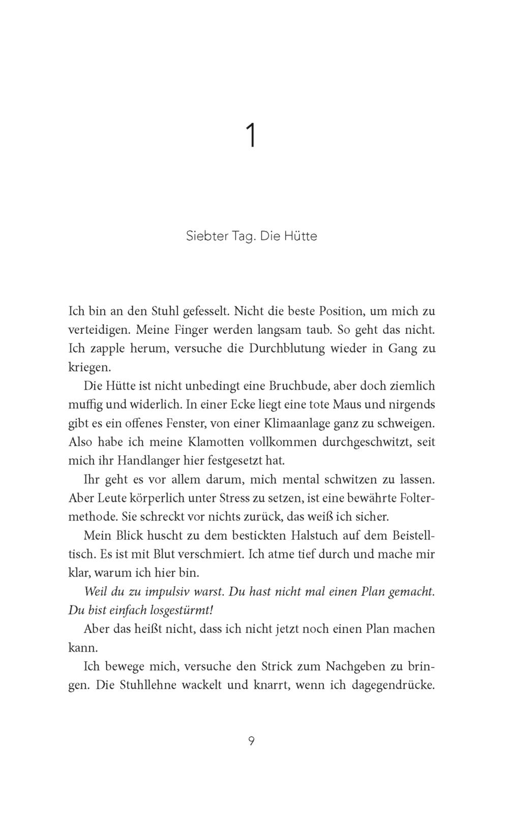 Die Highschool ist geschafft, aber Noras Zukunft sieht düster aus: Ihr Stiefvater Raymond wurde aus der Haft entlassen und hat sie im Visier. Darum ist Nora fest entschlossen, ihren (vielleicht letzten) Sommer zu genießen. Sie plant eine mehrtägige Rucksacktour mit Iris und Wes. Zwar klinkt sich spontan Wes' Freundin ein, doch Amanda ist cool, also ist es keine große Sache – bis sie entführt wird. Besser gesagt, bis sie mit Nora verwechselt wird. Jetzt hat Raymond eine Geisel. Und Nora, Iris und Wes müssen ihr ganzes Können aufbieten, um es lebend – und mit Amanda – aus dem Wald zu schaffen.