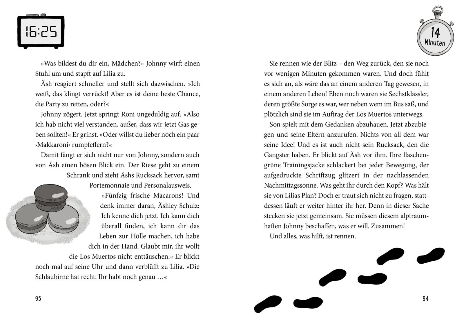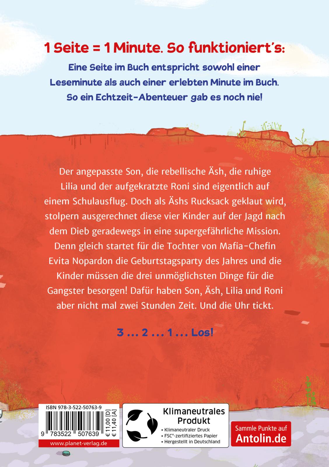 Der angepasste Son, die rebellische Äsh, die ruhige Lilia und der aufgekratzte Roni sind eigentlich auf einem Schulausflug in einer fremden Stadt, doch als Äshs Rucksack geklaut wird, stehen genau diese vier Kinder zusammen und stolpern auf der Jagd nach dem Dieb geradewegs in eine supergefährliche Mission. Denn gleich startet für die verwöhnte Tochter von Mafia-Chefin Evita Nopardon die Geburtstagsparty des Jahres! Und die Kinder bekommen den Rucksack nur zurück, wenn sie in kürzester Zeit die drei unmöglichsten Dinge besorgen: Macarons vom besten Bäcker der Stadt, ein diamantenbesetztes Einhorn-Handy und einen gefeierten YouTube-Star. Dafür haben Son, Äsh, Lilia und Roni aber nicht mal zwei Stunden Zeit. Und die Uhr tickt. Ab der ersten Seite ...