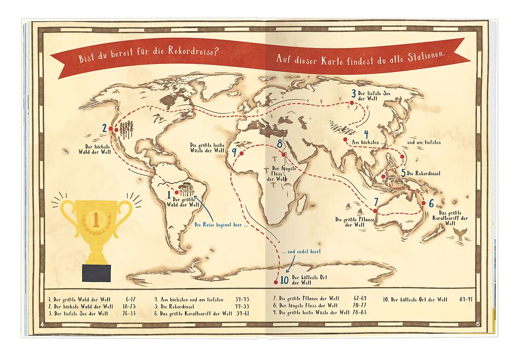 - Beschreibung "Eine Weltreise zu den verrücktesten Rekorden der Natur! Dieses Buch nimmt die Leser*innen mit auf eine Reise zu rekordverdächtigen Lebensräumen. Die größten Wälder, die tiefsten Seen oder die kältesten Wüsten. Auf detailreich illustrierten Doppelseiten stellt die Biologin Katharina Vestre, die verrücktesten Tier- und Pflanzenrekorde vor. Ein Sachbuch zum Staunen!