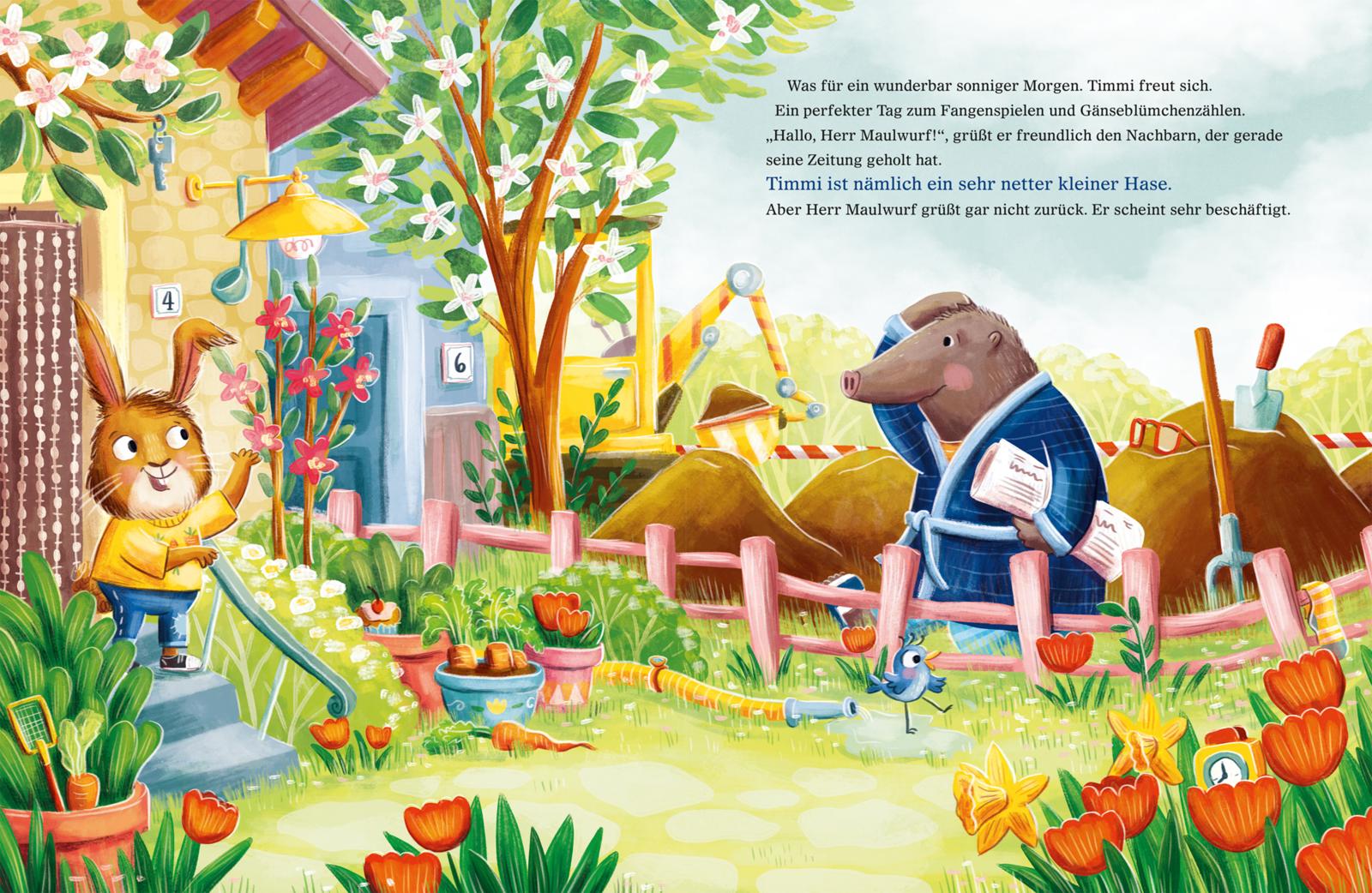 Manchmal ist das sehr nützlich, zum Beispiel, als Timmi die Rote Bete versteckt, die kein Hasenkind mag und die es eigentlich zum Mittagessen geben sollte. Frau Maus und ihre sieben Kinder finden das Gemüse und können ihr Glück kaum fassen.