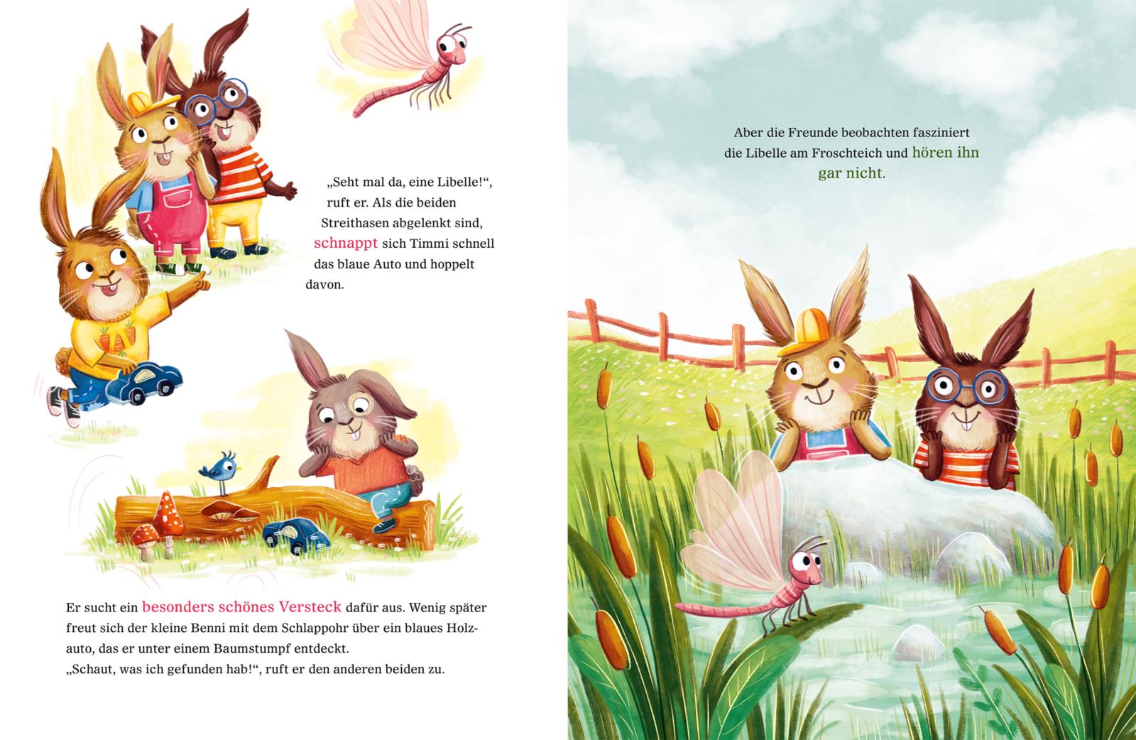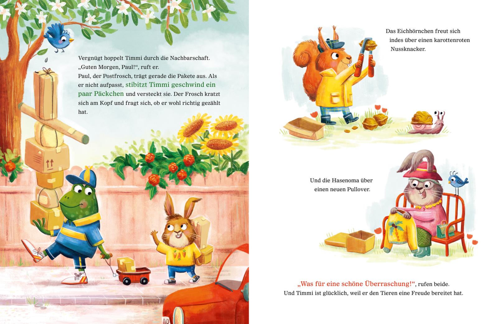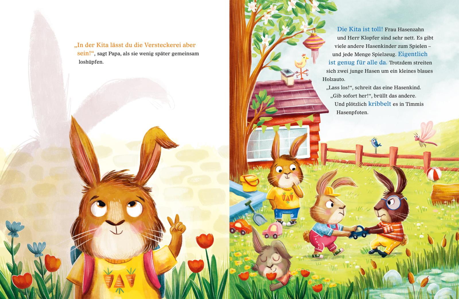 Und manchmal führt das zu allerhand Turbulenzen. Bei der Bastelstunde in der Kita zum Beispiel. Alle Hasenkinder bemalen Eier, denn damit sollen Bäume und Sträucher geschmückt werden. Als die Eier fertig sind, sehen sie wunderschön aus. Viel zu schade, um sie an einen Baum zu hängen, findet Timmi! Bestimmt freuen sich auch andere über diesen Anblick.