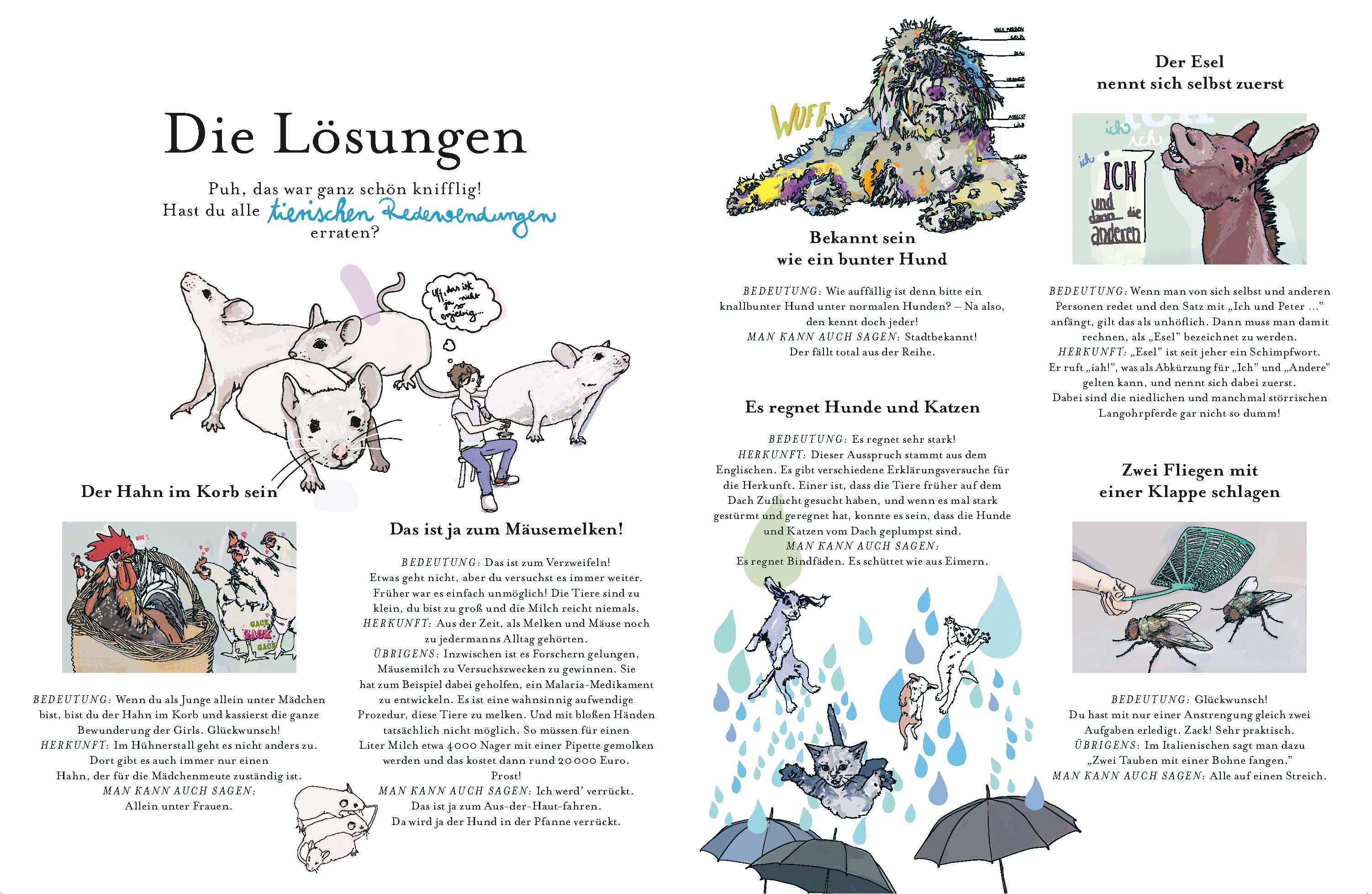 Von schwarzen Schafen, bunten Hunden und pfeifenden Schweinen: Wer erkennt diese tierischen Redewendungen anhand eines Bildes? Mirja Winkelmann hat die bekanntesten Sprichwörter aus der Tierwelt originell in Szene gesetzt. „Da brat mir einer einen Storch“ oder „Die Katze aus dem Sack lassen“, diese Redewendungen werden oft benutzt, aber woher kommen sie eigentlich und was bedeuten sie? Viele werden schon seit Jahrhunderten weitergegeben, aber warum gibt man dem Affen eigentlich Zucker oder holt die Kuh vom Eis? Ein unterhaltsamer Rätsel-Spaß für die ganze Familie!