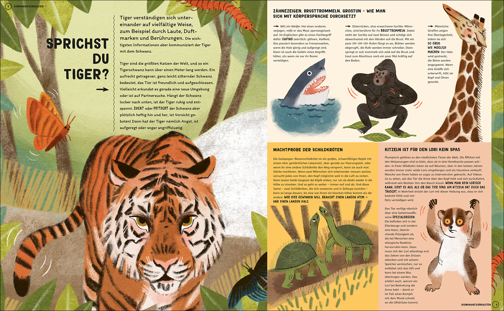 Wir Menschen können sprechen und so alles mitteilen, was wir wollen. Aber wie macht das ein Tiger? Er kann ja nicht sprechen. Wie alle Tierarten haben die Tiger erstaunliche Techniken entwickelt, um sich miteinander zu verständigen – ganz ohne Worte. Genauso verschieden wie die Tiere selbst sind auch ihre Sprachen. Hunde niesen, Bienen tanzen, Fische furzen (kein Witz!). Manche finden wir seltsam, manche lustig, manche geben uns bis heute Rätsel auf, aber alle erfüllen in der Natur ihren Zweck. So können die Tiere Artgenossen warnen oder ihnen helfen, Zuneigung zeigen und flirten.