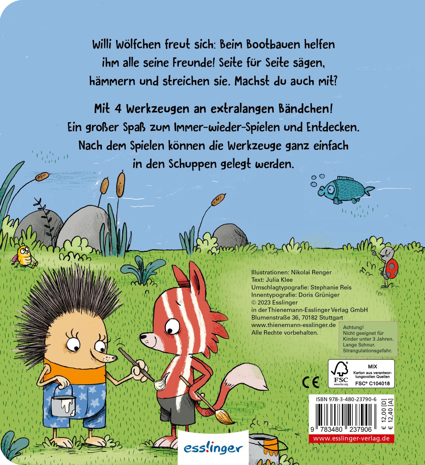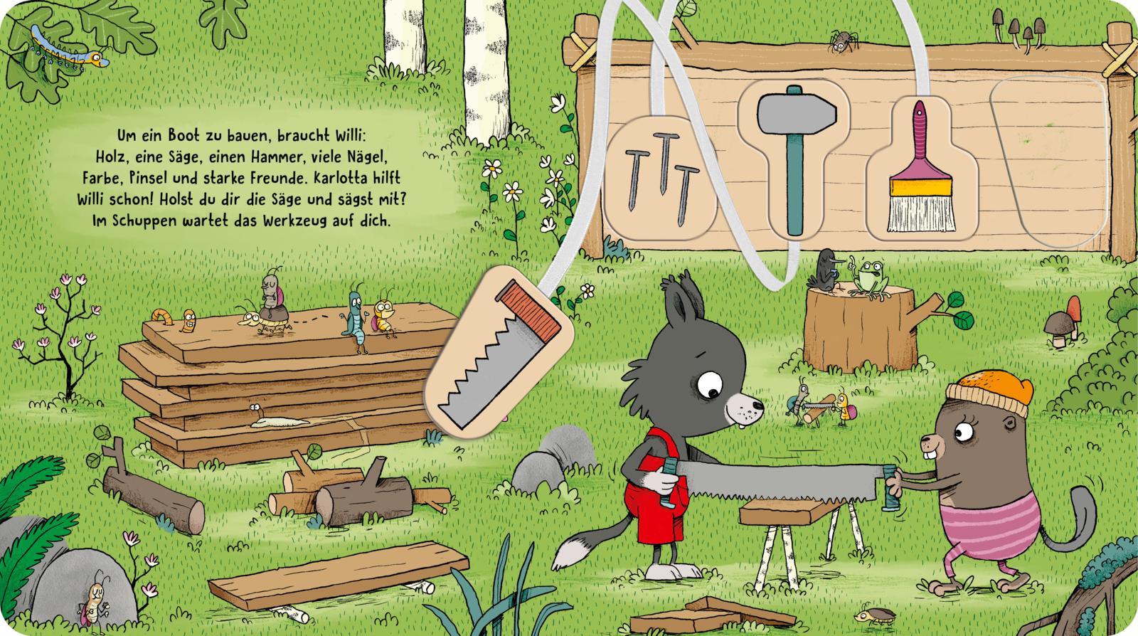Tolle Mitmach-Pappe für kleine Baumeister*innen mit extra Spiel-Werkzeugen! Willi Wölfchen und seine Freunde bauen ein Boot! Mit den innovativen Werkzeugen an langen Bändern am Buch helfen Kinder ab 3 Jahren spielend leicht beim Sägen, Hämmern und Streichen. Was für ein großer Spaß zum Mitmachen und Immer-wieder-Spielen! Säge, Hammer, Nägel und Pinsel können nach dem Spielen ganz einfach zurück in den Werkzeug-Schuppen gepuzzelt werden. So geht kein Werkzeug verloren und Aufräumen macht schon den Kleinsten große Freude.