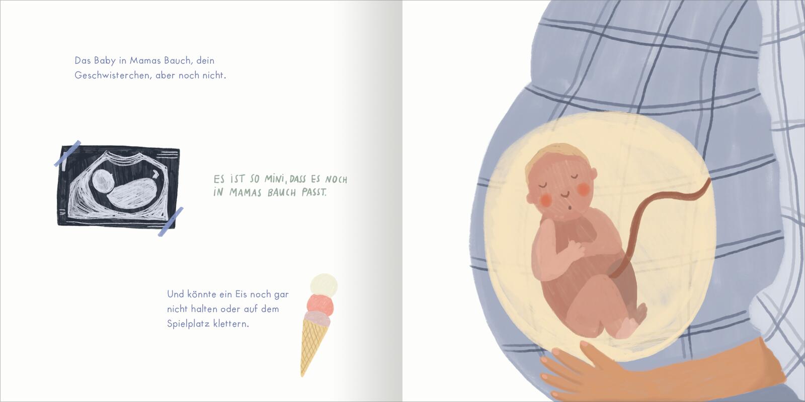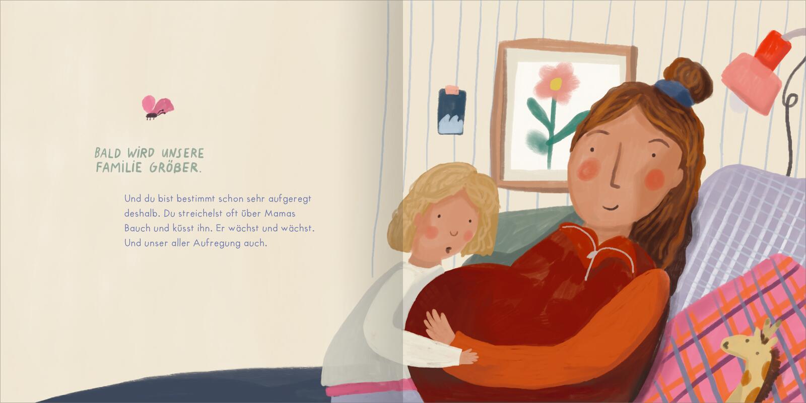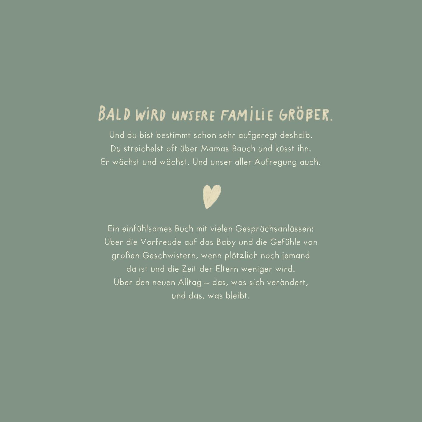 „Bald wird unsere Familie größer. Und du bist bestimmt schon sehr aufgeregt deshalb. Du streichelst oft über Mamas Bauch und küsst ihn. Er wächst und wächst. Und unser aller Aufregung auch.“