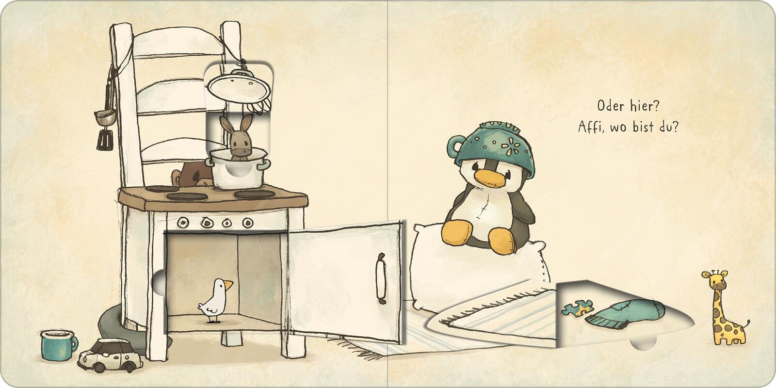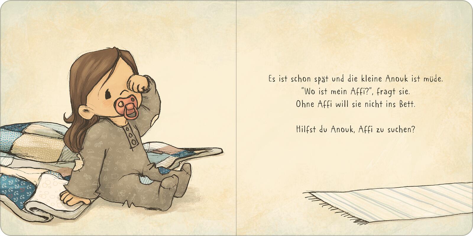 Anouk ist müde und muss ins Bett. Doch ohne ihren Affi kann sie nicht schlafen ... Ein liebevolles Gutenachtbuch mit Schieber auf dem Cover und vielen Klappen.