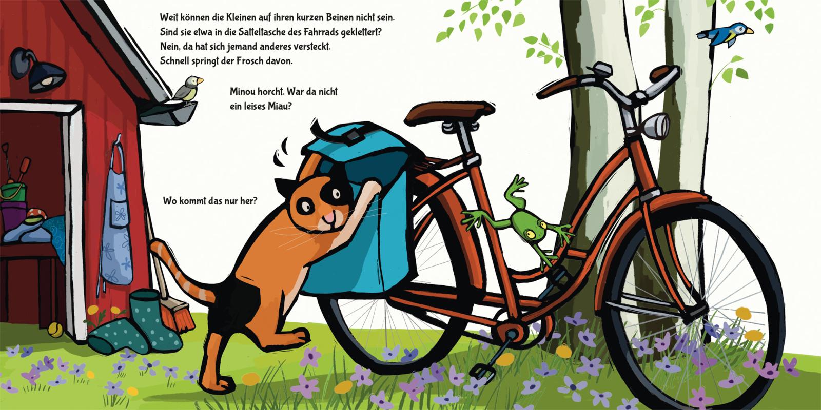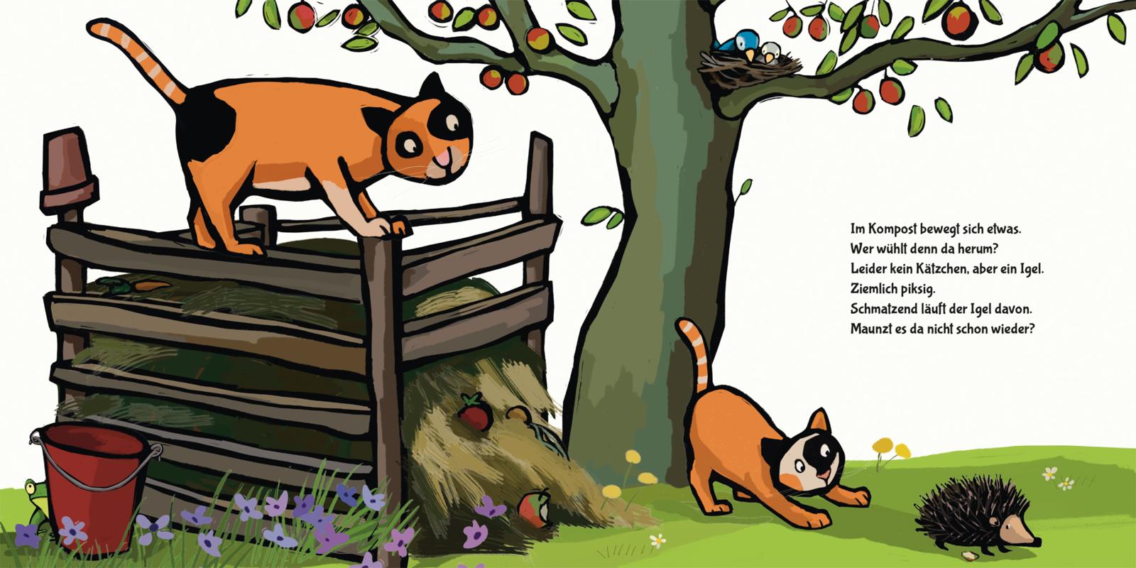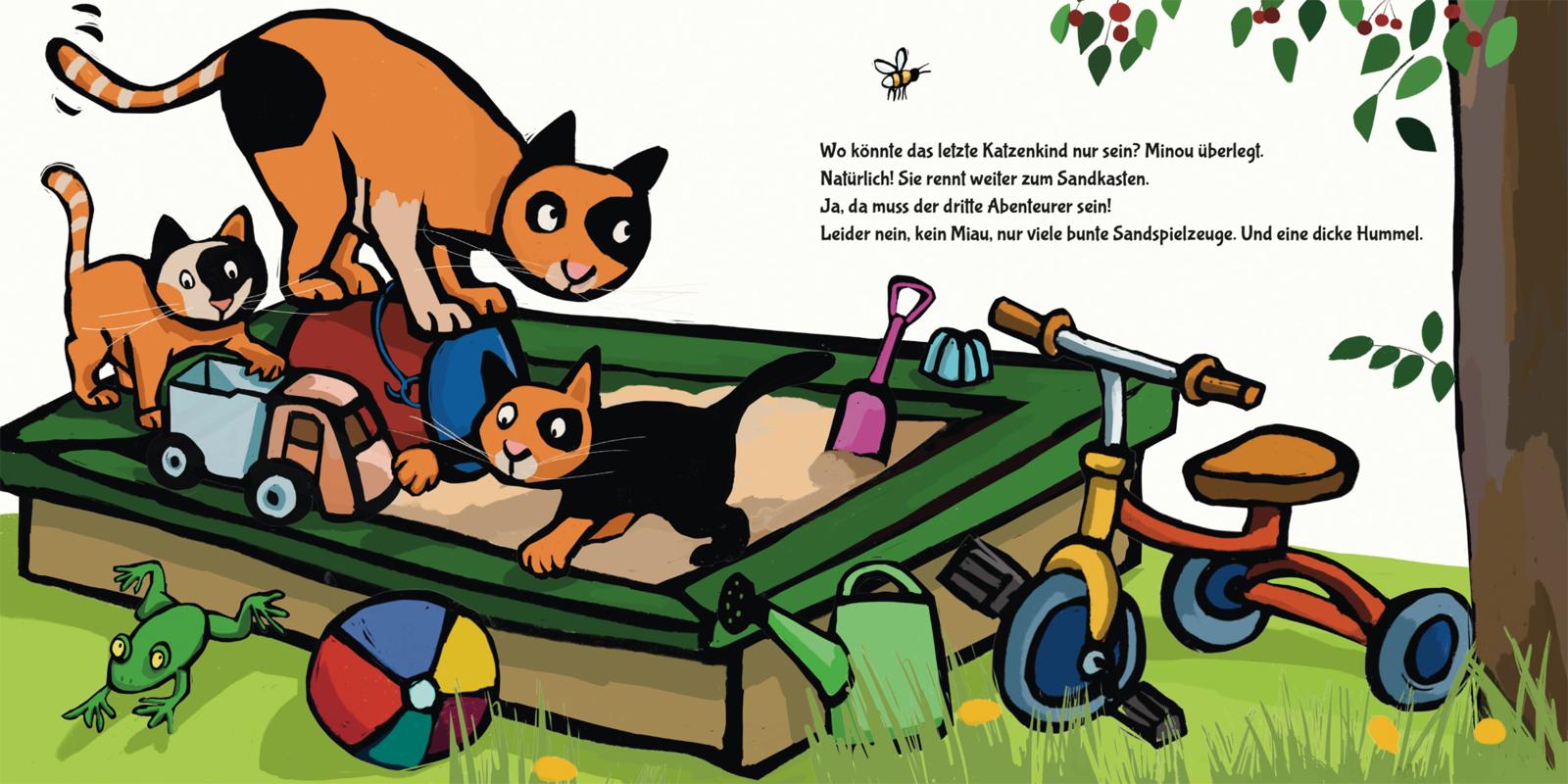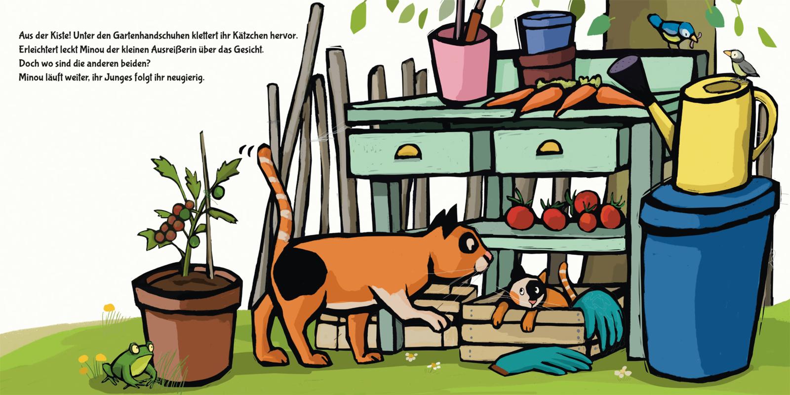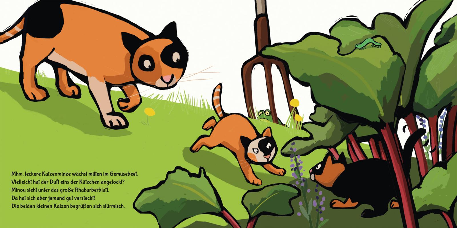 Oje, die Katze Minou blickt aufmerksam umher. Wo sind nur ihre drei Katzenkinder? Sind sie etwa ausgebüxt? Die Katzenmama macht sich auf die Suche durch den Garten. Wo die kleinen Racker wohl stecken?