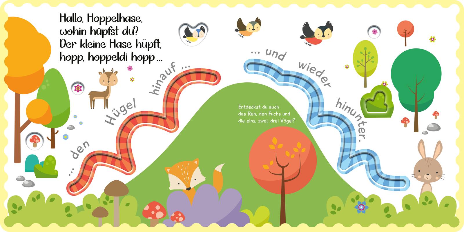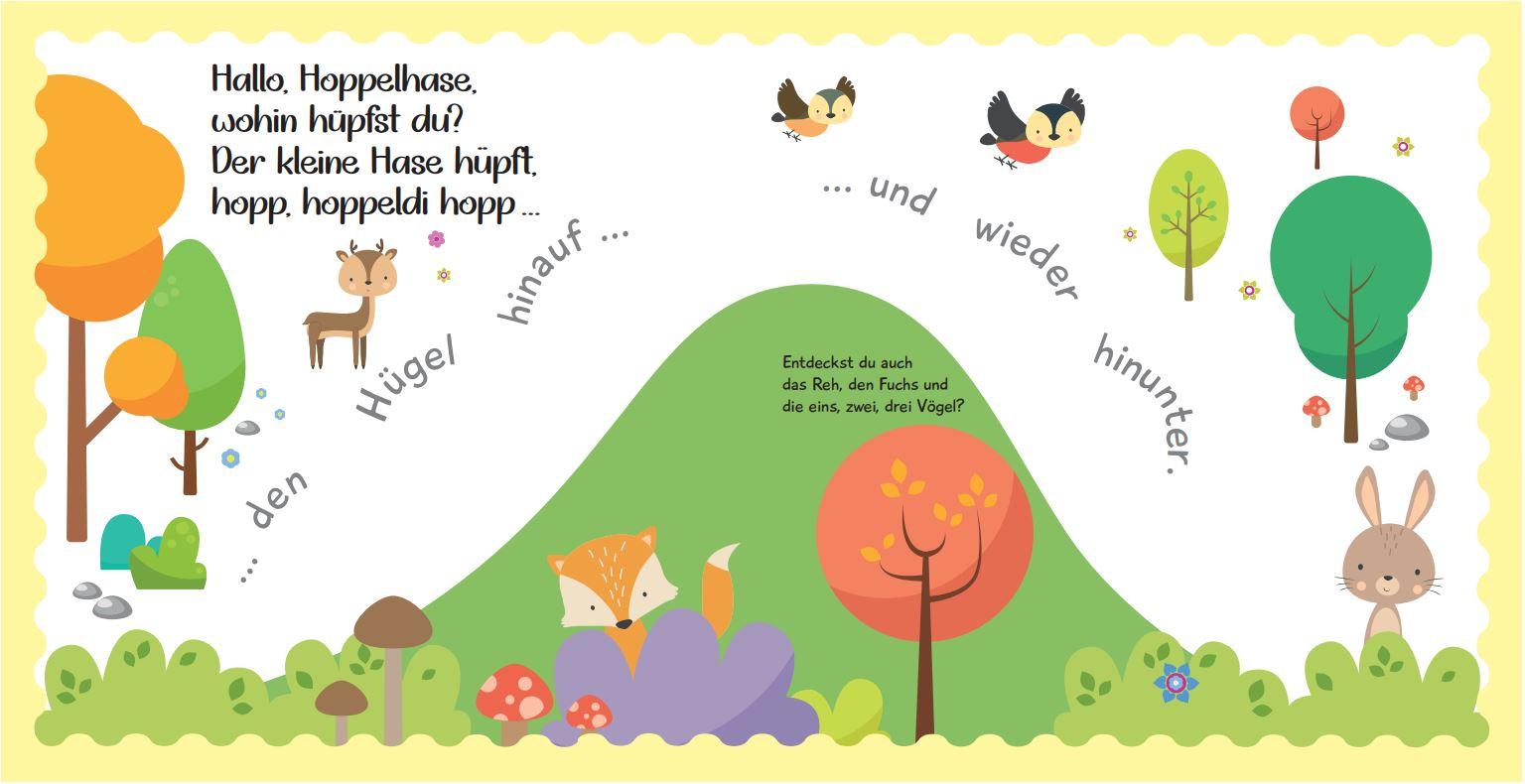 Ein erstes Buch mit niedlichem Hasenkind, das zum Schauen und Fühlen, Hören und Mitsprechen einlädt! Der kleine Hoppelhase ist auf dem Nachhauseweg zu seiner Mama. Und die kleinen Leser*innen begleiten ihn, mit den Fingerchen und lustigen Lautwiederholungen. Hopp, hoppeldi hopp! Wo hüpft der kleine Hasen denn entlang? Den Hügel hinauf und wieder hinunter. Und Psst! vorbei am schlafenden Hund. Und Hopp! mit einem Satz über den Bach. Und hoppeldi! einmal durch den hohlen Baumstamm hindurch. Ein interaktiver Spaß für die Kleinsten. Das bereitet ganz gewiss viel Freude zu jeder Zeit.