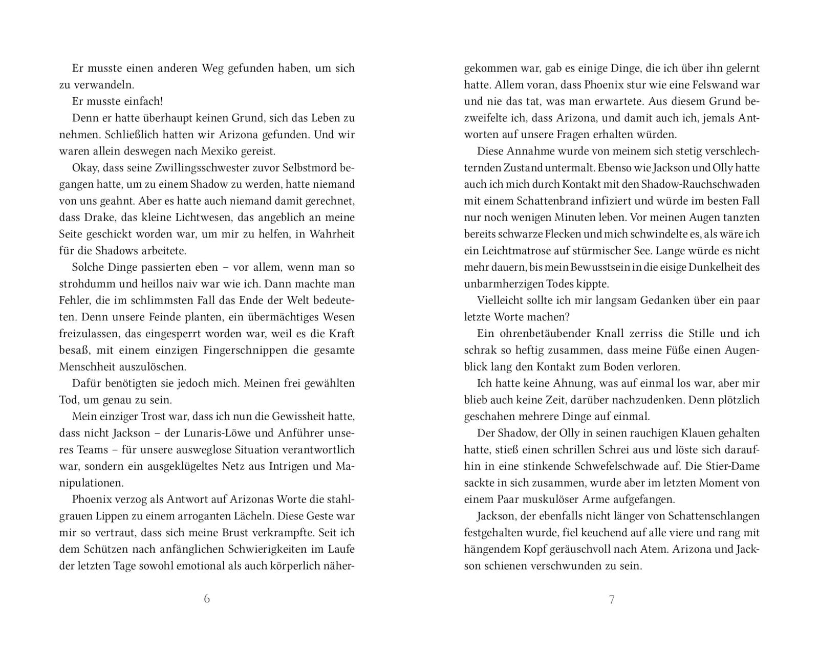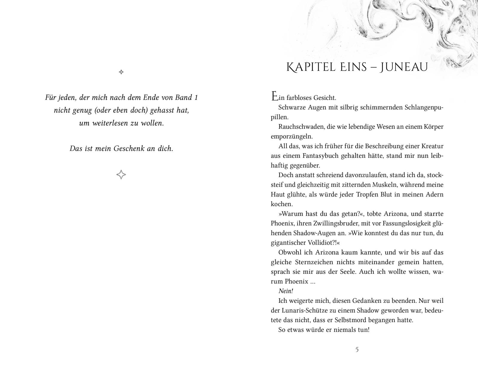 Als June nach den Ereignissen in Mexiko wieder zu sich kommt, ist nichts mehr, wie es war. Die anderen Lunaris misstrauen June, sogar Jackson geht ihr aus dem Weg. Da taucht ausgerechnet Drake mit einem Brief von Phoenix auf. Er will sie sehen und behauptet, sich bei den Shadows einschleusen zu wollen. Doch June zweifelt an ihm, denn der Schütze wirkt verändert. Früher nie um einen frechen Spruch verlegen, ist er auf einmal kühl und distanziert. Kann sie ihm noch vertrauen?