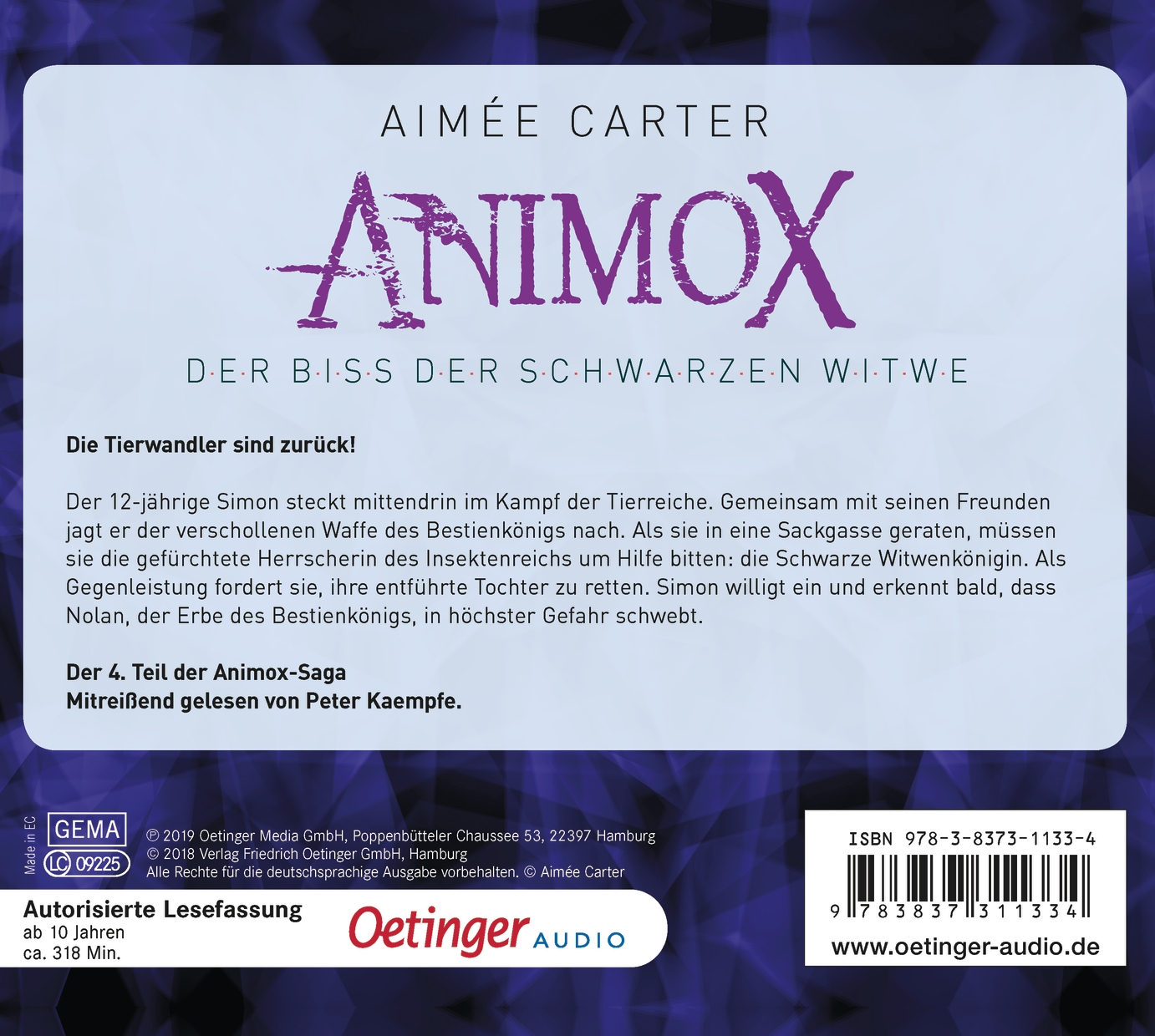 Der 12-jährige Simon steckt mittendrin im Kampf der Tierreiche. Gemeinsam mit seinen Freunden jagt er der verschollenen Waffe des Bestienkönigs nach. Als sie in eine Sackgasse geraten, müssen sie die gefürchtete Herrscherin des Insketenreichs um Hilfe bitten: die Schwarze Witwenkönigin. Als Gegenleistung fordert sie, ihre entführte Tochter zu retten. Simon willigt ein und erkennt bald, dass Nolan, der Erbe des Bestienkönigs, in höchster Gefahr schwebt. Packende Tierfantasy rund um einen starken Helden, atmosphärisch erzählt von Aimée Carter.