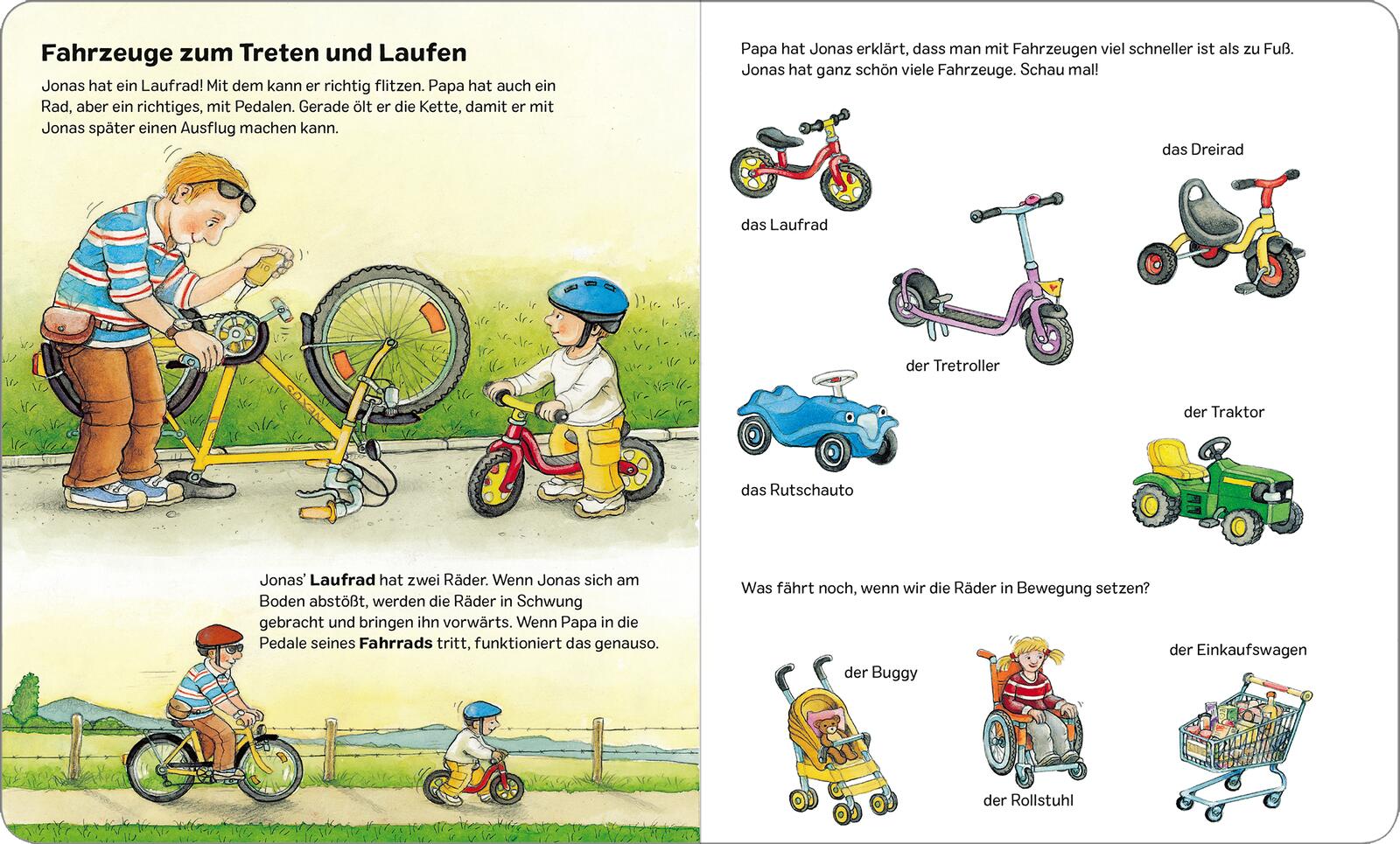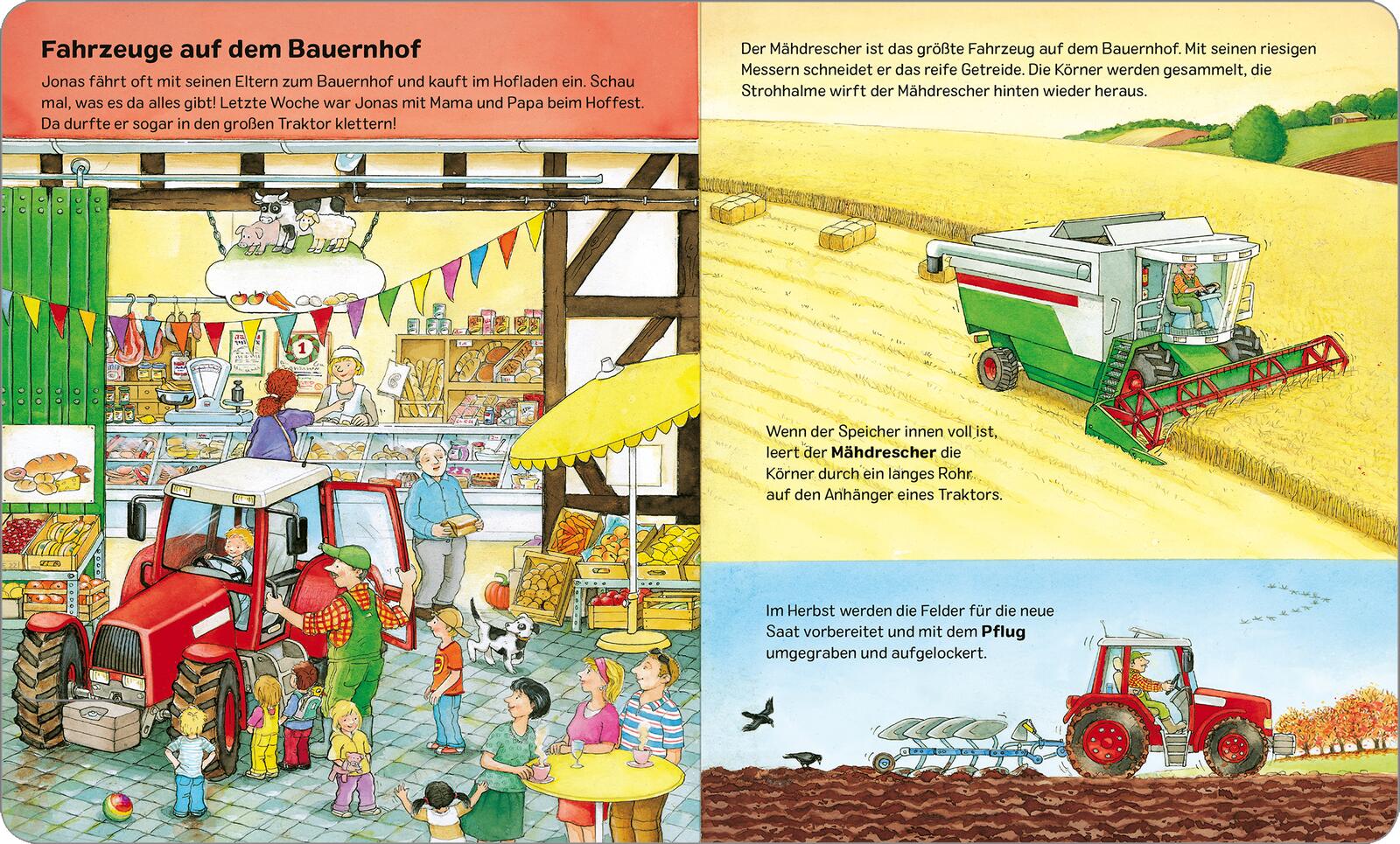 Realistische Illustrationen zeigen die Lieblingsfahrzeuge der Kleinen. Vom Mähdrescher, über den Krankenwagen, den Radlader oder den Betonmischer, hier gibt es viel zu entdecken.