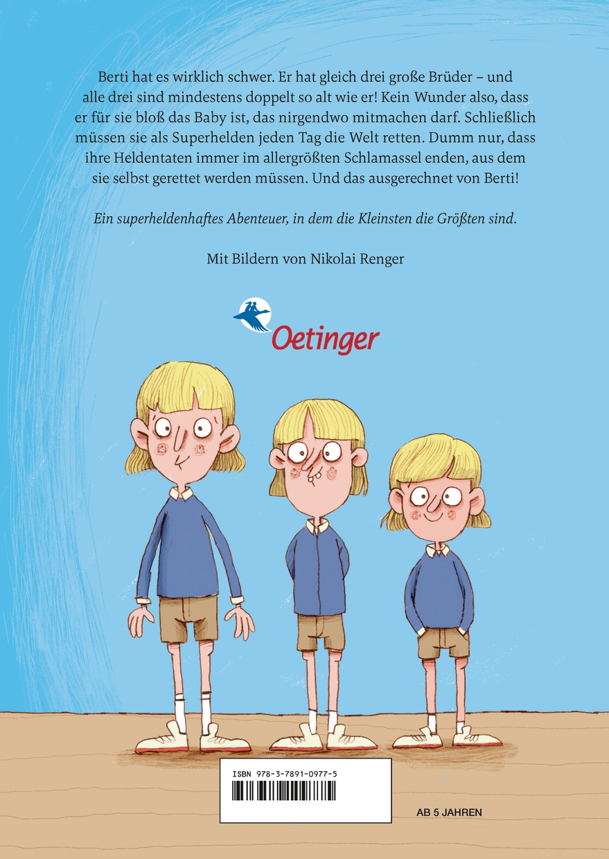 Geschwisterspaß zwischen Herdmanns und Krachmacherstraße: Der fünfjährige Berti hat es wirklich schwer. Er hat gleich drei große Brüder – und alle drei sind mindestens doppelt so alt wie er! Kein Wunder also, dass er für sie bloß das Baby ist, das nirgendwo mitmachen darf. Schließlich müssen sie als Superhelden jeden Tag die Welt retten. Dumm nur, dass ihre Heldentaten immer im allergrößten Schlamassel enden, aus dem sie selbst gerettet werden müssen. Und das ausgerechnet von Berti!