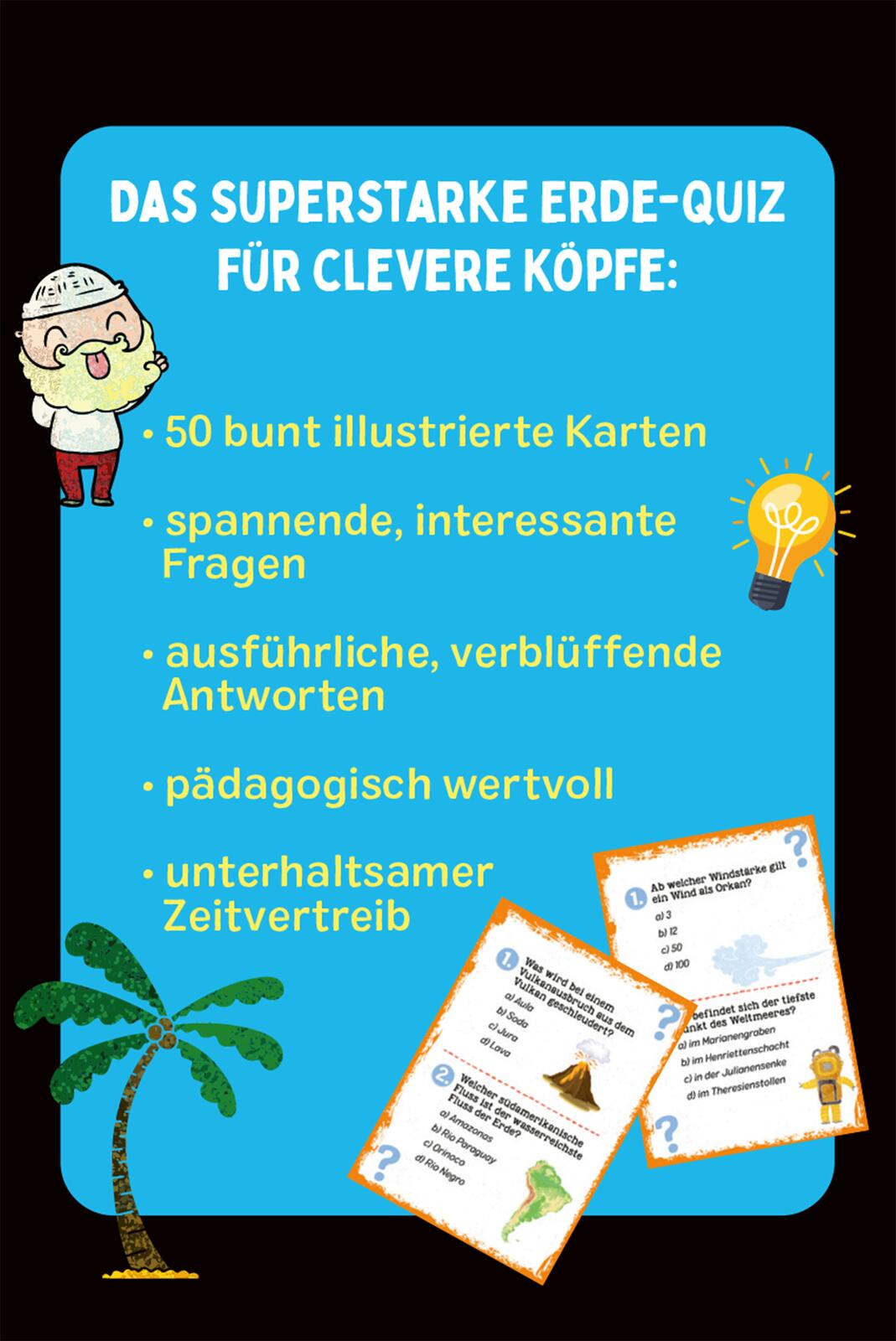 Mit vielen informativen Rätseln rund um den Planet Erde auf 50 bunt illustrierten Quizkarten: Wie heißt der höchste Berg Afrikas? Welcher Fluss ist der längste in Europa? Wo befindet sich der tiefste Punkt des Weltmeeres? Welche Insel ist für ihre großen Statuen aus Stein bekannt? Dieses Wissens-Quiz bietet über 100 abwechslungsreiche Fragen und Antworten.
