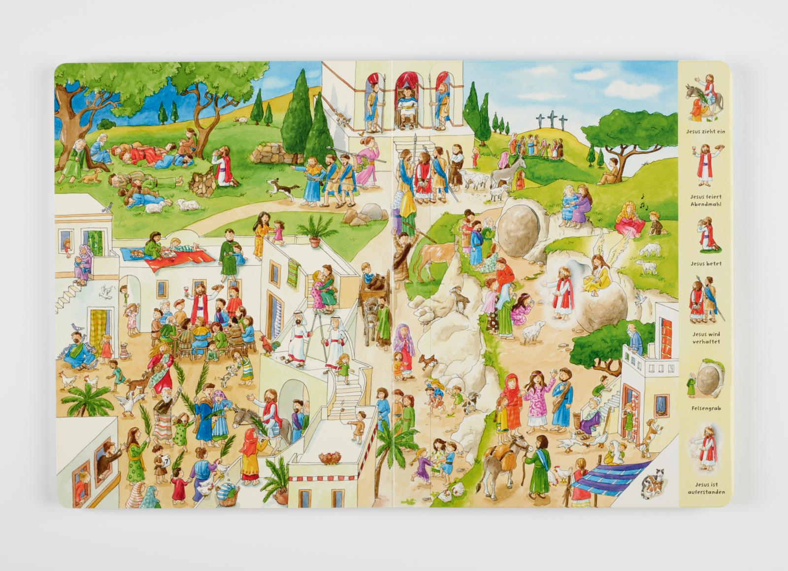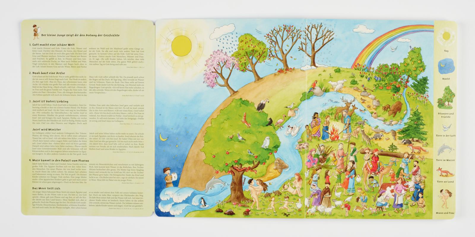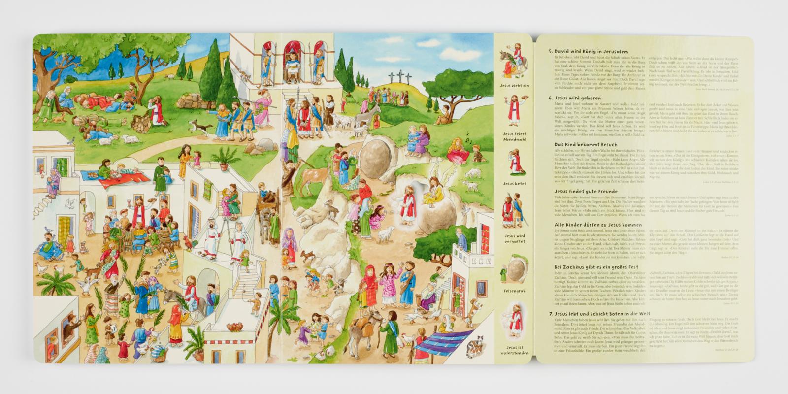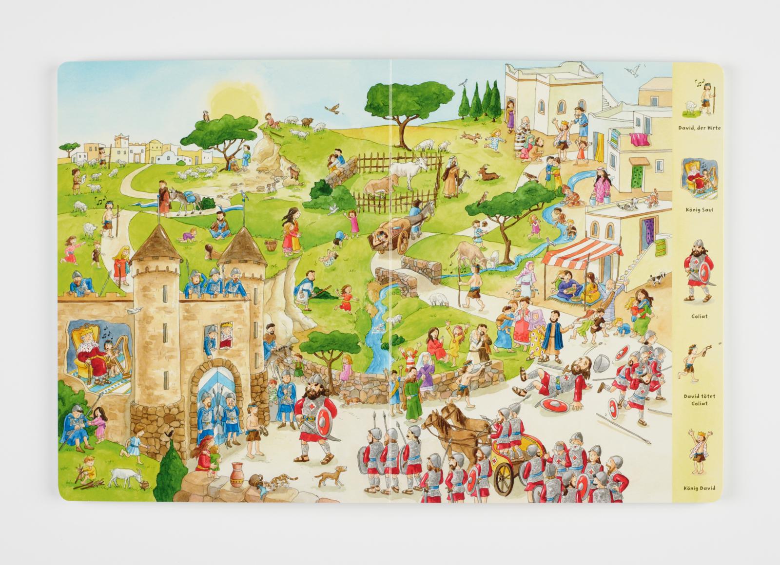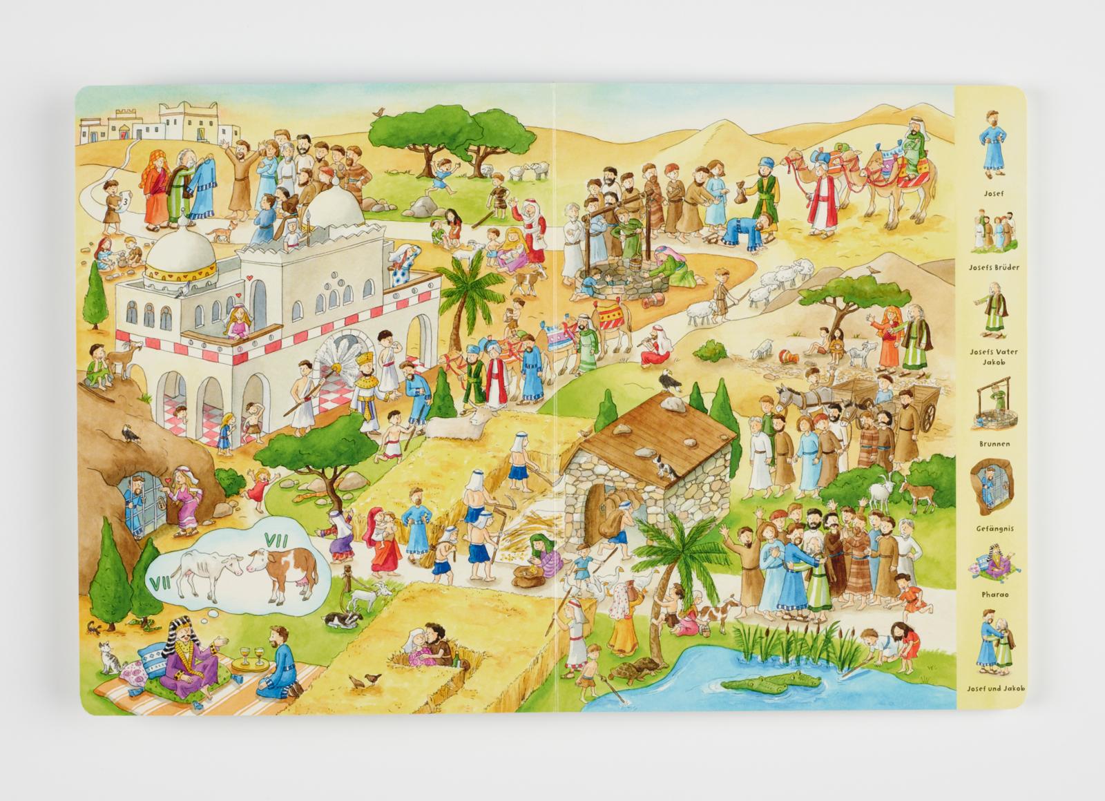 Ein Bibel-Wimmelbuch für Kinder ab 2 Jahren mit Suchleisten und Ausklappseiten.Die schönsten und bekanntesten Geschichten in großen, wimmeligen Bildern: von der Schöpfung, der Arche Noah, von Josef, Mose, David, von Weihnachten und Ostern. Und wer mag, kann sich die Geschichten auf den Aufklappseiten vorlesen lassen, oder macht sich gleich mit dem Finger auf die Reise. Ein kleiner Junge mit Schriftrolle weist dabei auf jeder Seite den Weg und mit den Bildern an der Seite ist Suchspaß garantiert.