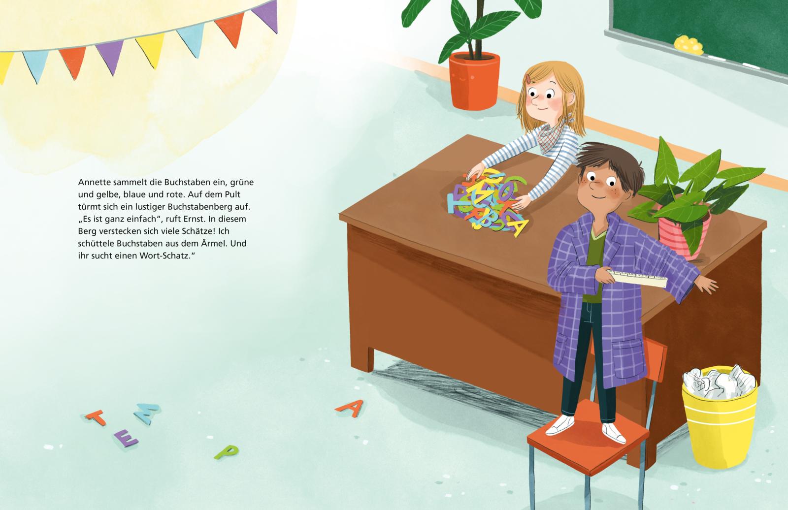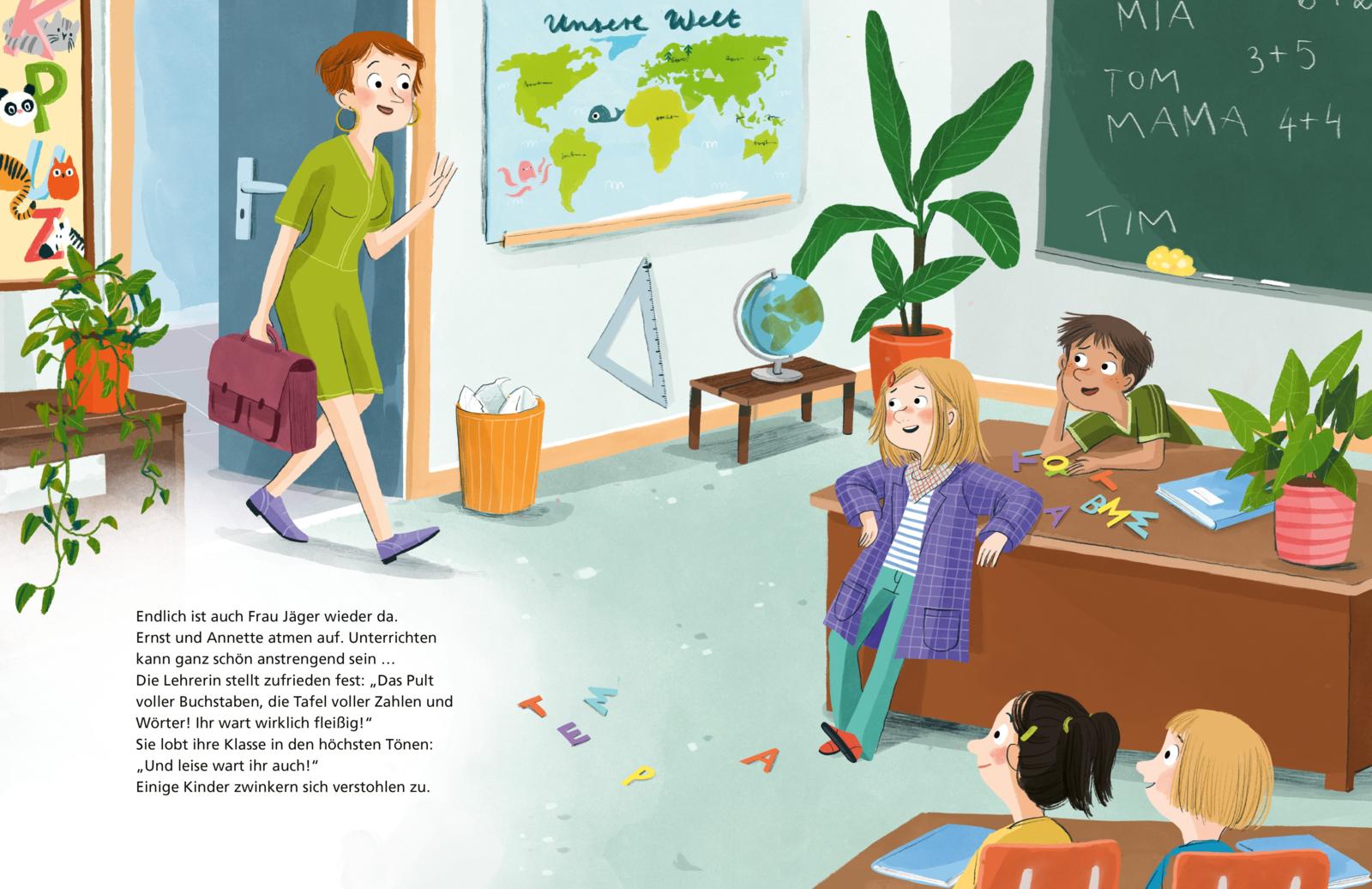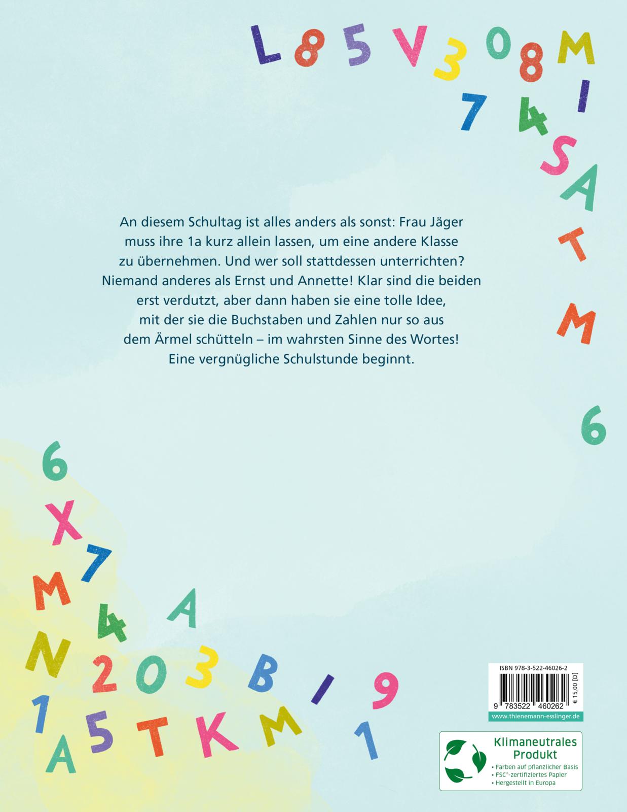 An diesem Schultag ist alles anders als sonst: Frau Jäger muss ihre 1A kurz allein lassen, um eine andere Klasse zu übernehmen. Und wer soll stattdessen unterrichten? Niemand anders als Ernst und Annette! Klar sind die beiden erst verdutzt, aber dann haben sie eine tolle Idee, mit der sie die Buchstaben und Zahlen nur so aus dem Ärmel schütteln – im wahrsten Sinne des Wortes! Eine vergnügliche Schulstunde beginnt.